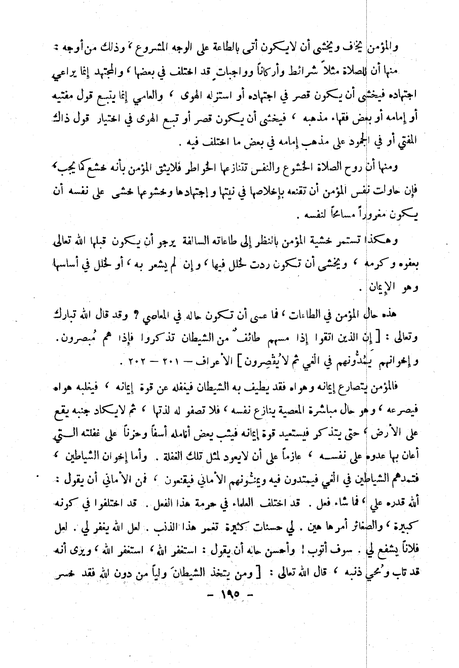 هذه حال المؤمن في الطاعات، فما عسى أن تكون حاله في المعاصي؟ وقد قال الله تبارك وتعالى: [إِنَّ الَّذِينَ اتَّقَوْا إِذَا مَسَّهُمْ طَائِفٌ مِنَ الشَّيْطَانِ تَذَكَّرُوا فَإِذَا هُمْ مُبْصِرُونَ وَإِخْوَانُهُمْ يَمُدُّونَهُمْ فِي الْغَيِّ ثُمَّ لا يُقْصِرُونَ الأعراف - 201 - 202.