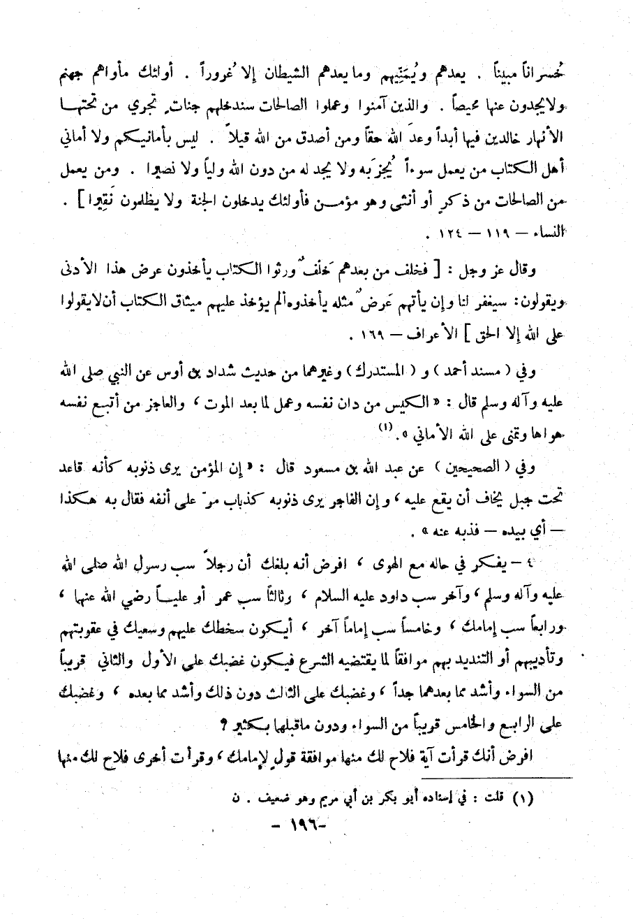 خُسْرَاناً مُبِيناً. يَعِدُهُمْ وَيُمَنِّيهِمْ وَمَا يَعِدُهُمُ الشَّيْطَانُ إِلَّا غُرُوراً. أُولَئِكَ مَأْوَاهُمْ جَهَنَّمُ وَلا يَجِدُونَ عَنْهَا مَحِيصاً. وَالَّذِينَ آمَنُوا وَعَمِلُوا الصَّالِحَاتِ سَنُدْخِلُهُمْ جَنَّاتٍ تَجْرِي مِنْ تَحْتِهَا الْأَنْهَارُ خَالِدِينَ فِيهَا أَبَداً وَعْدَ اللَّهِ حَقّاً وَمَنْ أَصْدَقُ مِنَ اللَّهِ قِيلاً. لَيْسَ بِأَمَانِيِّكُمْ وَلا أَمَانِيِّ أَهْلِ الْكِتَابِ مَنْ يَعْمَلْ سُوءاً يُجْزَ بِهِ وَلا يَجِدْ لَهُ مِنْ دُونِ اللَّهِ وَلِيّاً وَلا نَصِيراً. وَمَنْ يَعْمَلْ مِنَ الصَّالِحَاتِ مِنْ ذَكَرٍ أَوْ أُنْثَى وَهُوَ مُؤْمِنٌ فَأُولَئِكَ يَدْخُلُونَ الْجَنَّةَ وَلا يُظْلَمُونَ نَقِيراً].النساء - 119 - 124.