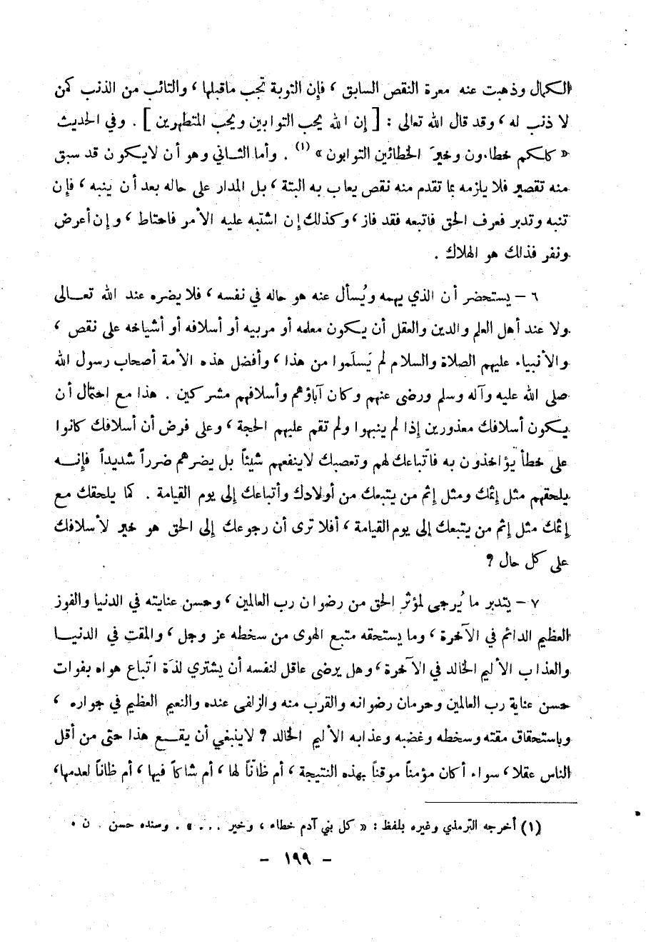 الكمال وذهبت عنه معرة النقص السابق، فإن التوبة تجب ما قبلها، والتائب من الذنب كمن لا ذنب له، وقد قال الله تعالى: [إِنَّ اللَّهَ يُحِبُّ التَّوَّأبينَ وَيُحِبُّ الْمُتَطَهِّرِينَ]. وفي الحديث ((كلكم خطاءون وخير الخطائين التوابون)) (1). وأما الثاني وهو أن لا يكون قد سبق منه تقصير فلا يلزمه بما تقدم منه نقص يعاب به البتة، بل المدار على حاله بعد أن ينبه، فإن تدبر وتنبه معرف الحق فإتبعه فقد فاز، وكذلك إن اشتبه عليه الأمر فإحتاط، وإن أعرض ونفر فذلك هو الهلاك.