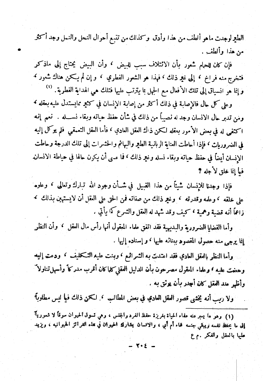 و على كل حال فلإصابة في ذلك أكثر من إصابة الإنسان في كثير مما يستدل عليه بعقله ، ومن تدبر حال الإنسان وجد له نصيباً من ذلك في شأن حفظ حياته وبقاء نسله . نعم إنه اكتفى له في بعض الأمور بعقله لكن ذاك العقل العادي ، فأما العقل التعمقي فلم يوكل إليه في الضروريات ، فإذا أحاطت العناية الربانية الطير والبهائم والحشرات إلى تلك الدرجة وحاطت الإنسان أيضاً في حفظ حياته وبقاء نسله وغير ذلك ، فما عسى أن يكون حالها في حياطة الإنسان فما إنما خلق لأجله ؟