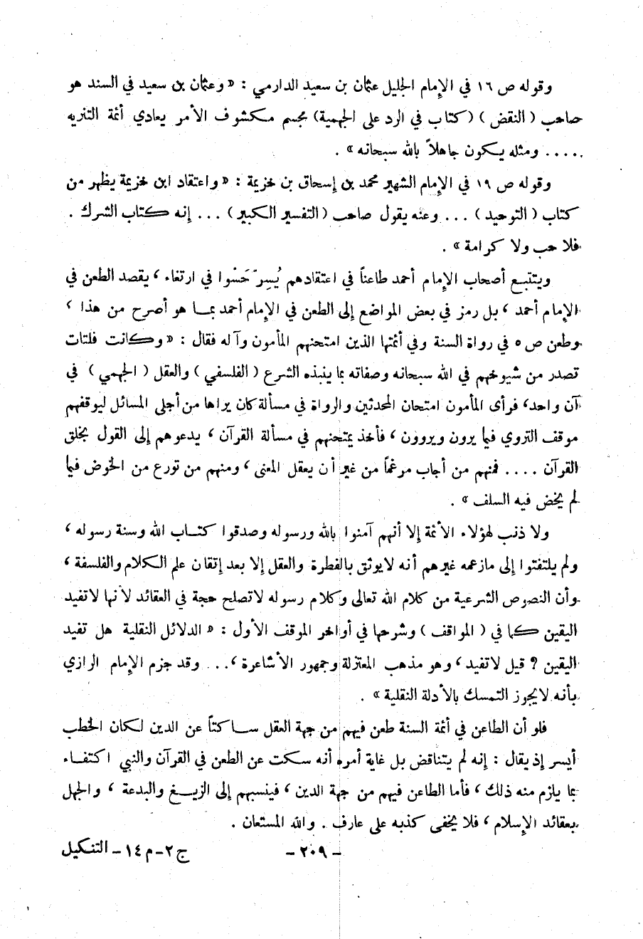 و قوله ص 16 في الامام الجليل عثمان بن سعيد الدارمي : (( عثمان بن سعيد في السند هو صاحب ( النقض ) ( كتاب الرد على الجهمية ) مجسم مكشوف الأمر يعادي أئمة التنزيه ... . ومثله يكون جاهلاً بالله سبحانه )) .