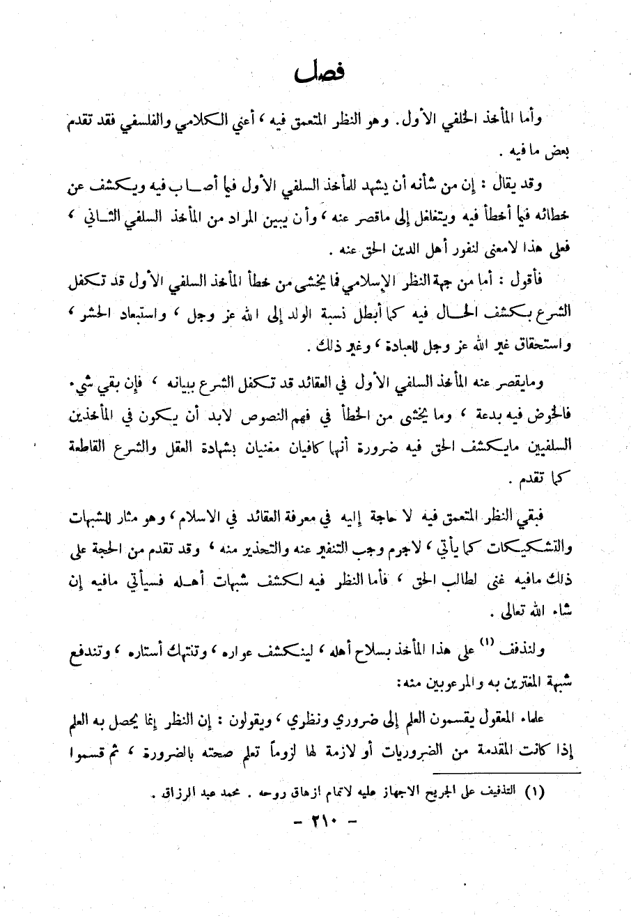 فأقول: أما من جهة النظر الإسلامي فما يخشى من خطأ المأخذ السلفي الأول قد تكفل الشرع بكشف الحال فيه كما أبطل نسبة الولد إلى الله عز وجل، وستبعاد الحشر، واستحاق غير الله عز وجل للعبادة، وغير ذلك.