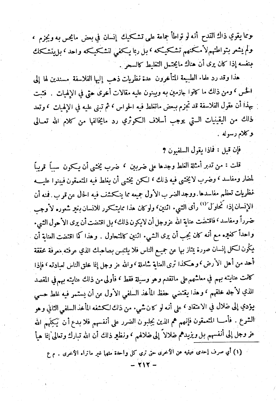 قلت : من تدبر أمثلة الغلط وجدها على ضربين ، ضرب يخشى أن يكون سبباً قريباً لمضار ومفاسد ، وضرب لا يخشى فيه ذلك ، لكن يخشى أن يغلط فيه المتعمقون فيبنوا عليه نظريات تعظم مفاسدها . ووجد الضرب الأول جميعه مما ينكشف فيه الحال عن قرب فمنه أن الإنسان إذا تحاول (1) رأى الشيء أثنين ، ولو كان هذا مما يتكرر للإنسان بغير شعوره لأوجب ضرراً ومفاسد ، فأقتضت عناية الله عز وجل أن لا يكون ذلك ، بل اقتضت أن يرى الأحول الشيء واحد كغيره مع أنه كان يجب أن يرى الشيء أثنين كالمتحاول . وهذا كما اقتضت العناية أن يكون لكل إنسان صورة يمتاز بها عن جميع الناس فلا يلتبس بصاحبك الذي عرفته معرفة محققة أح من أهل الأرض ، وهكذا ترى العناية شاملة ، والله عز وجل إنما خلق الناس لعبادته ، فإذا كانت عنايته به في معاشهم على ما تقدم وهو وسيلة فقط ، فأولى من ذلك عنايته بهم في المقصد الذي لأجله خلقهم، وهذا يقتضي حفظ المأخذ السلفي الأول عن أن يستمر فيه غلط حسي يؤدي إلى ضلال في الاعتقاد ، على أنه لو كان شيء من ذلك لكشفه المأخذ السلفي الثاني وهو الشرع . فأما المتعمقون فإنهم هم الذين يجلبون الضرر على أنفسهم فلا بدع أن يكلمهم الله عز وجل إلى أنفسهم بل ويزيدهم ضلالاً إلى ضلالهم ، ونظير ذلك أن الله تبارك وتعالى إنما هيأ