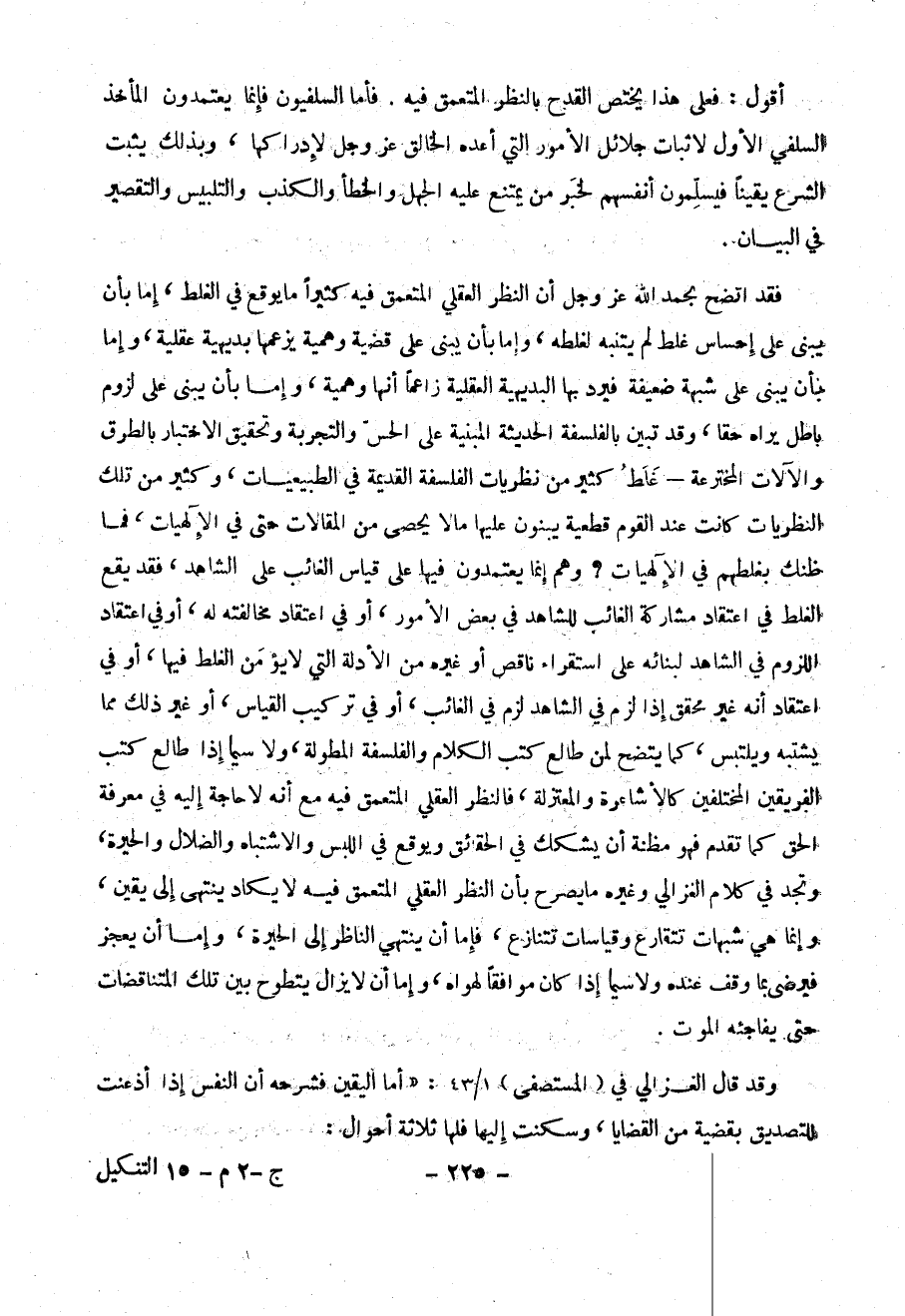 فقد اتضح بحمد الله عز وجل أن النظر العقلي المتعمق فيه كثيراً ما يوقع في الغلط ، إما بأن يبنى على إحساس غلط لم يتنبه لغلطه ، وإما بأن يبنى على قضية وهمية يزعمها بديهية عقلية ، وإما بأن يبنى على شبهة ضعيفة فيرد بها البديهية العقلية زاعماً أنها وهمية ، وإما بأن يبنى على لزوم باطل يراه حقاً ، وقد تبين بالفلسفة الحديثة المبنية على الحس والتجربة وتحقيق الاختبار بالطرق والآلات المخترعة – غلط كثير من نظريات الفلسفة القديمة في الطبيعيات ، وكثير من تلك النظريات كانت عند القوم قطعية يبنون عليها ما لا يحصى من المقالات حتى في الإلهيات ، فما ظنك بغلطهم في الإلهيات ؟ وهم يعتمدون فيها على قياس الغائب على الشاهد ، فقد يقع الغلط في اعتقاد مشاركة الغائب للشاهد في بعض الأمور ، أو في اعتقاد مخالفته له ، أو في اعتقاد اللزوم في الشاهد أبنائه على استقرار ناقص أو غيره من الأدلة التي لا يؤمن الغلط فيها ، أو في اعتقاد أنه غير محقق إذا لزم في الشاهد لزم في الغائب ، أو في تركيب القياس ، أو غير ذلك مما يشتبه ويلتبس ، كما يتضح لمن طالع كتب الكلام والفلسفة المطولة ، ولاسيما إذا طالع كتب الفريقين المختلفين كالأشاعرة والمعتزلة ، فالنظر العقلي المتعمق فيه مع أنه لا حاجة إليه في معرفة الحق كما تقدم فهو مظنة أن يشكك في الحقائق ويوقع في اللبس والاشتباه والضلال والحيرة ، وتجد في كلام الغزالي وةغيره ما يصرح بأن النظر العقلي المتعمق فيه لا يكاد ينتهي إلى يقين ، وإنما هي شبهات تتقارع وقياسات تتنازع ، فأما أن ينتهي الناظر إلى الحيرة ، وأما أن يعجز فيرضى بما وقف عنده ولاسيما إذا كان موافقاً لهواه ، وأما أن لا يزال يتطوح بين تلك المتناقضات حتى يفاجئه الموت .