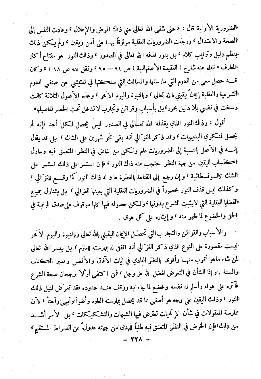 الضرورية الأولية قال : (( حتى شفى الله تعالى عني ذاك المرض والإعلال ، وعادت النفس إلى الصحة والاعتدال ، ورجعت الضروريات العقلية موثقاً بها على أمن ويقين ، ولم يكن ذلك بنظم دليل وترتيب كلام ، بل بنور قذفه الله تعالى في الصدور ، وذلك النور هو مفتاح أكثر المعارف )) نقله عن شارح ( العقيدة الأصفهانية )