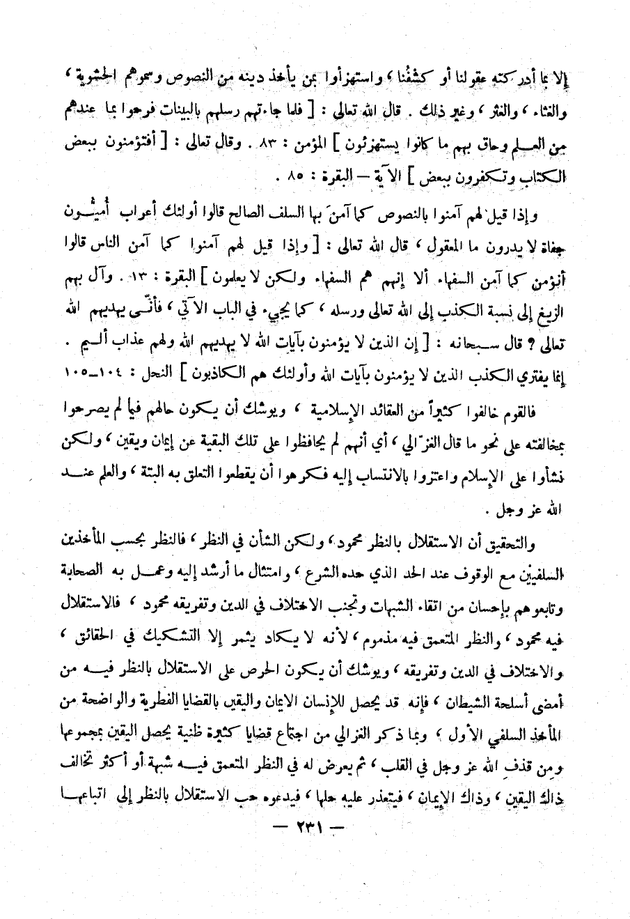 والتحقيق عن الاستقلال بالنظر محمود، ولكن الشأن في النظر، فالنظر بحسب المأخذين السلفيين مع الوقوف عند الحد الذي حده الشرع، وامتثال ما أرشد إليه وعمل به الصحابة وتابعوهم بإحسان من اتقاء الشبهات وتجنب الاختلاف في الدين وتفريطه محمود، فالاستقلال فيه محمود، والنظر المتعمق فيه مذموم، لأنه لا يكاد يثمر إلا التشكيك في الحقائق، والاختلاف في الدين وتفريقه، ويوشك أن يكون الحرص على الاستقلال بالنظر فيه من أمضى أسلحة الشيطان، فأنه قد يحصل للإنسان الإيمان واليقين بالقضايا الفطرية والواضحة من المأخذ السلفي الأول، وبما ذكر الغزالي من اجتماع قضايا كثيرة ظنية يحصل اليقين بمجموعها ومن قذف الله عز وجل في القلب، ثم يعرض له في النظر المتعمق فيه شبهة أو أكثر تخالف ذلك اليقين، وذاك الإيمان، فيتعذر عليه حلها، فيدعوه حب الاستقلال بالنظر إلى إتباعها