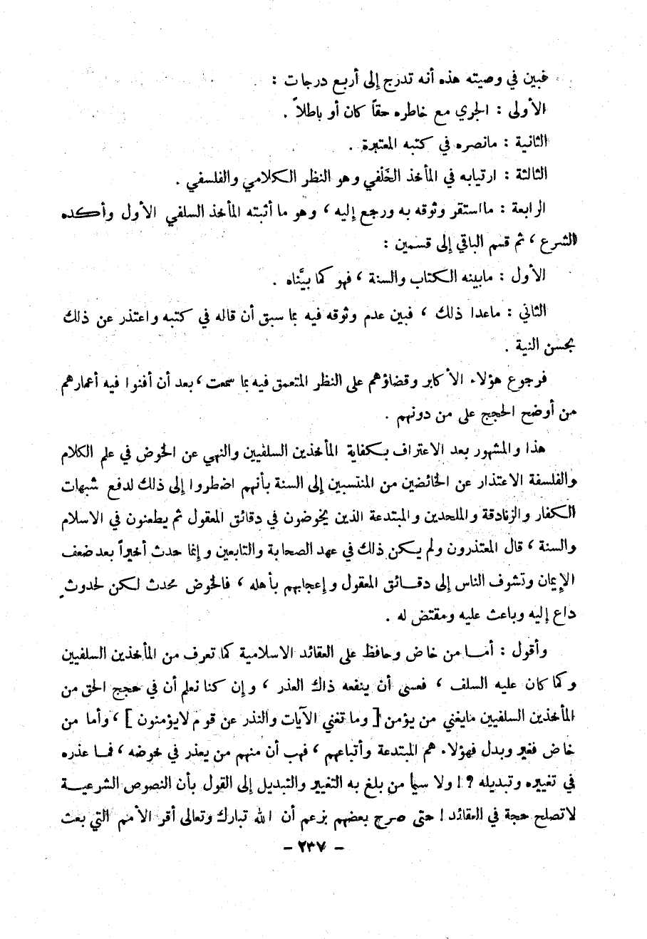 الرابعة : ما استقر وثوقه به ورجع إليه ، وهو ما أثبته المأخذ السلفي الأول وأكده الشرع ، ثم قسم الباقي إلى قسمي :