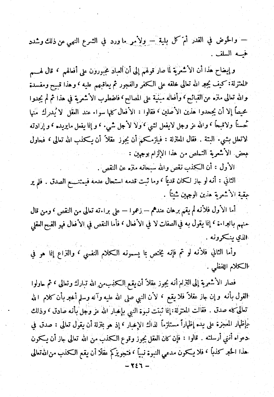 أما الأول فلأنه لم يقم برهان عندهم – زعموا – على براءته تعالى من النقص ، ومن قال منهم بالبراءة ، إنما يقول به في الصفات لا في الأفعال ، فأما النقص في الأفعال فهو القبح العقلي الذي ينكرونه .