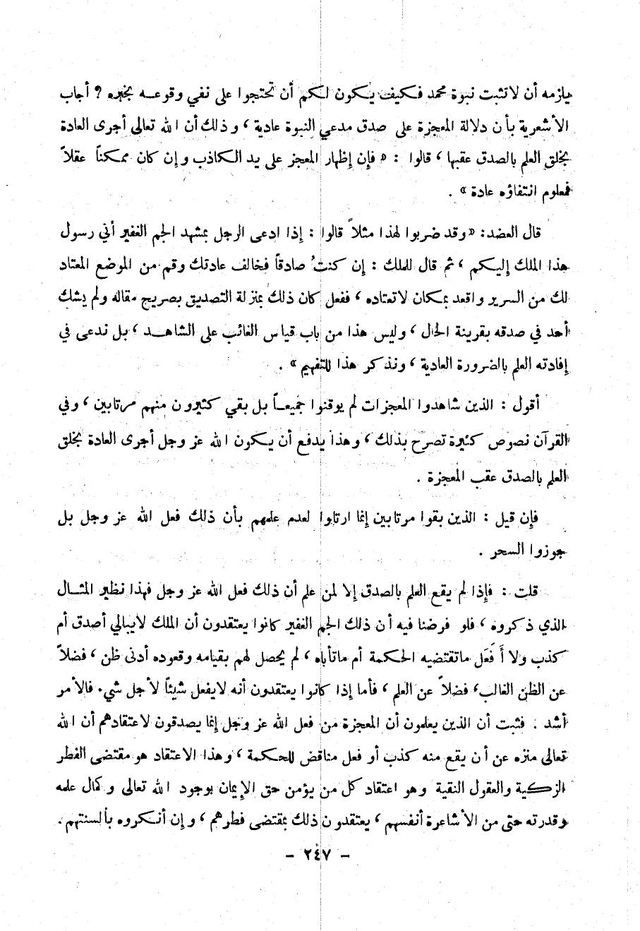قلت : فإذا لم يقع العلم بالصدق إلا لمن علم أن ذلك فعل الله عز وجل فهذا نظير المثال الذي ذكروه ، فلو فرضنا فيه أن ذلك الجم الغفير كانوا يعتقدون أن الملك لا يبالي أصدق أم كذب ولا أَفَعَل ما تقتضيه الحكمة أم ما آتاه ، لم يحصل لهم بقيامه وقعوده أدنى ظن ، فصلاً عن الظن الغالب ، فضلاً عن العلم ، فأما إذا كانوا يعتقدون أنه لا يفعل شيئاً لأجل شئ فالأمر أشد . فثبت أن الذين يعلمون أن المعجزة من فعل الله عز وجل وإنما يصدقون لا اعتقادهم أن الله تعالى منزه عن أن يقع منه الكذب أو فعل مناقض للحكمة ، وهذا الاعتقاد هو مقتضى الفطر الزكية والعقول النقية وهو اعتقاد كل من يؤمن حق الإيمان بوجود الله تعالى وكمال علمه وقدرته حتى من الأشاعرة أنفسهم ، يعتقدون ذلك بمقتضى فطرهم ، وإن أنكروا بألسنتهم .