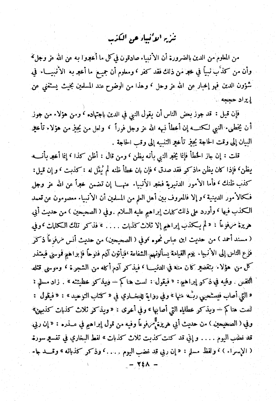 قلت : إن جاز الخطأ فإنما يخبر النبي بأنه يظن ، ومن قال / أظن كذا ، إنما أخبر بأنه يظن ، فإذا كان يظن ما ذكر فقد صدق ، فإن بان خطأ ظنه لم يقل له : كذبت ، وإن قيل : كذب ظنك، فأما الأمور الدنيوية فخبر الأنبياء عنها إن تضمن خبراً عن الله عز وجل فكالأمور الدنيوية ، وإلا فالمعروف بين أهل العلم من المسلمين أن الأنبياء معصومون عن تعمد الكذب فيها ، وأورد على ذلك كلمات إبراهيم عليه السلام . وفي ( الصحيحين )من حديث أبي هريرة مرفوعاً : (( لم يكذب إبراهيم إلا ثلاث كذبات ... )) فذكر تلك الكلمات ، وفي ( مسند أحمد ) من حديث ابن عباس نحوه ، وفي ( الصحيحين ) من حديث أنس مرفوعاً ذكر فزع الناس إلى الأنبياء يوم القيامة يسألونهم الشفاعة ، فيأتون آدم فنوحاً فإبراهيم فموسى فيعتذر كل من هؤلاء بتقصير كان منه في الدنيا ، فيذكر آدم أكله من الشجرة ، وموسى قتله النفس . وفيه في ذكر إبراهيم : (( فيقول : لست هنا كم – ويذكر خطيئته )) . زاد مسلم : (( التي أصاب فيستحي ربه منها )) وفي رواية للبخاري في (( كتاب التوحيد )) : فيقول : لست هنا كم – ويذكر خطاياه التي أصابها )) وفي أخرى : (( ويذكر ثلاث كذبات كذبهن )) وفي ( الصحيحين ) من حديث أبي هريرة مرفوعاً وفيه قول إبراهيم في عذره : (( إن ربي قد غضب اليوم ... . وإني كنت كذبت ثلاث كذبات )) لفظ البخاري في تفسير سورة ( الإسراء ) ، ولفظ مسلم : (( إن ربي قد غضب اليوم ... . ، وذكر كذباته )) وقد جاء
