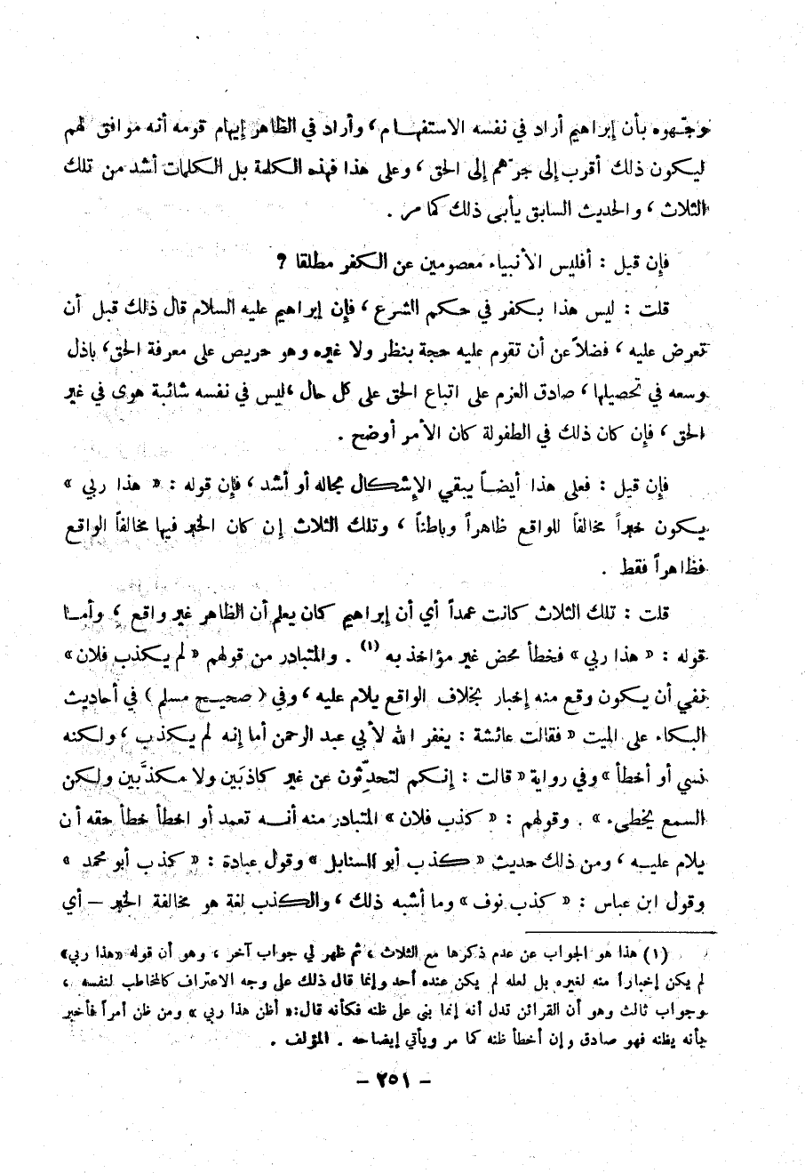 قلت : تلك الثلاث كانت عمداً أي أن إبراهيم كان يعلم أن الظاهر غير واقع ، وأم قوله : (( هذا ربي )) فخطأ محض غير مؤاخذ به (1) . والمتبادر من قولهم (( لم يكذب فلان ))نفي أن يكون وقع منه إخبار بخلاف الواقع يلام عليه ، وفي ( صحيح مسلم ) في أحاديث البكاء على الميت (( فقالت عائشة : يغفر الله لأبي عبد الرحمن أما إنه لم يكذب ، ولكنه نسي أو أخطأ )) وفي رواية (( قالت : إنكم لتحدثون عن غير كاذبين ولا مكذبين ولكن السمع يخطئ )) . وقولهم : (( كذب فلان )) المتبادر منه أنه تعمد أو أخطأ خطأ حقه أن يلام عليه ، ومن ذلك حديث (( كذب أبو السنابل )) وقول عبادة : (( كذب أبو محمد )) وقول ابن عباس : (( كذب نوف )) وما أشبه ذلك ، والكذب لغة هو مخالفة الخبر – أي