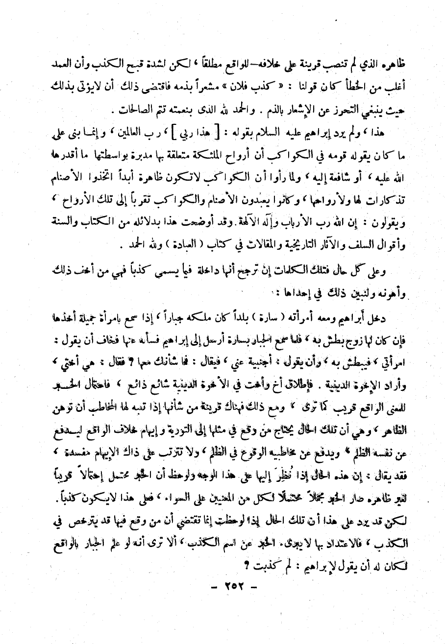 دخل إبراهيم ومعه امرأته ( سارة ) بلداً كان ملكه جباراً ، إذا سمع بامرأة جميلة أخذها فإن كان لها زوج بطش به ، فلما سمع الجبار بسارة أرسل إلى إبراهيم فسأله عنها فخاف أن يقول : امرأتي ، فيبطش به ، وأن يقول : أجنبية عني ، فيقال : فما شأنك معها ؟ فقال : هي أختي ، واراد الأخوة الدينية . فإطلاق أخ وأخت في الأخوة الدينية شائع ذائع ، فاحتمال الخبر للمعنى الواقع قريب كما ترى ، ومع ذلك فهناك قرينة من شأنها إذ تبه لها المخاطب أن توهن الظاهر ، وهي أن تلك الحال يحتاج من وقع في مثلها إلى التورية والإيهام خلاف الواقع ليدفع عن نفسه الظلم ، ويدفع عن مخاطبيه الوقوع في الظلم ، ولا تترتب على ذاك الإيهام مفسدة ، فقد يقال : إن هذه الحال إذا نظر إليها على هذا الوجه ولوحظ أن الخبر محتمل إحتمالاً قريباً لغير ظاهره صار الخبر مجملاًَ محتملاً لكل من المعنيين على السواء ، فعلى هذا لا يكون كذباً . لكن قد يرد على هذا أن تلك الحال إذا لوحظت إنما تقتضي أن من وقع فيها قد يترخص في الكذب ، فالاعتداد بها لا يبرئ الخبر عن إسم الكذب ، الا ترى أنه لو علم الجبار بالواقع لكان له أن يقول لإبراهيم : لم كذبت ؟