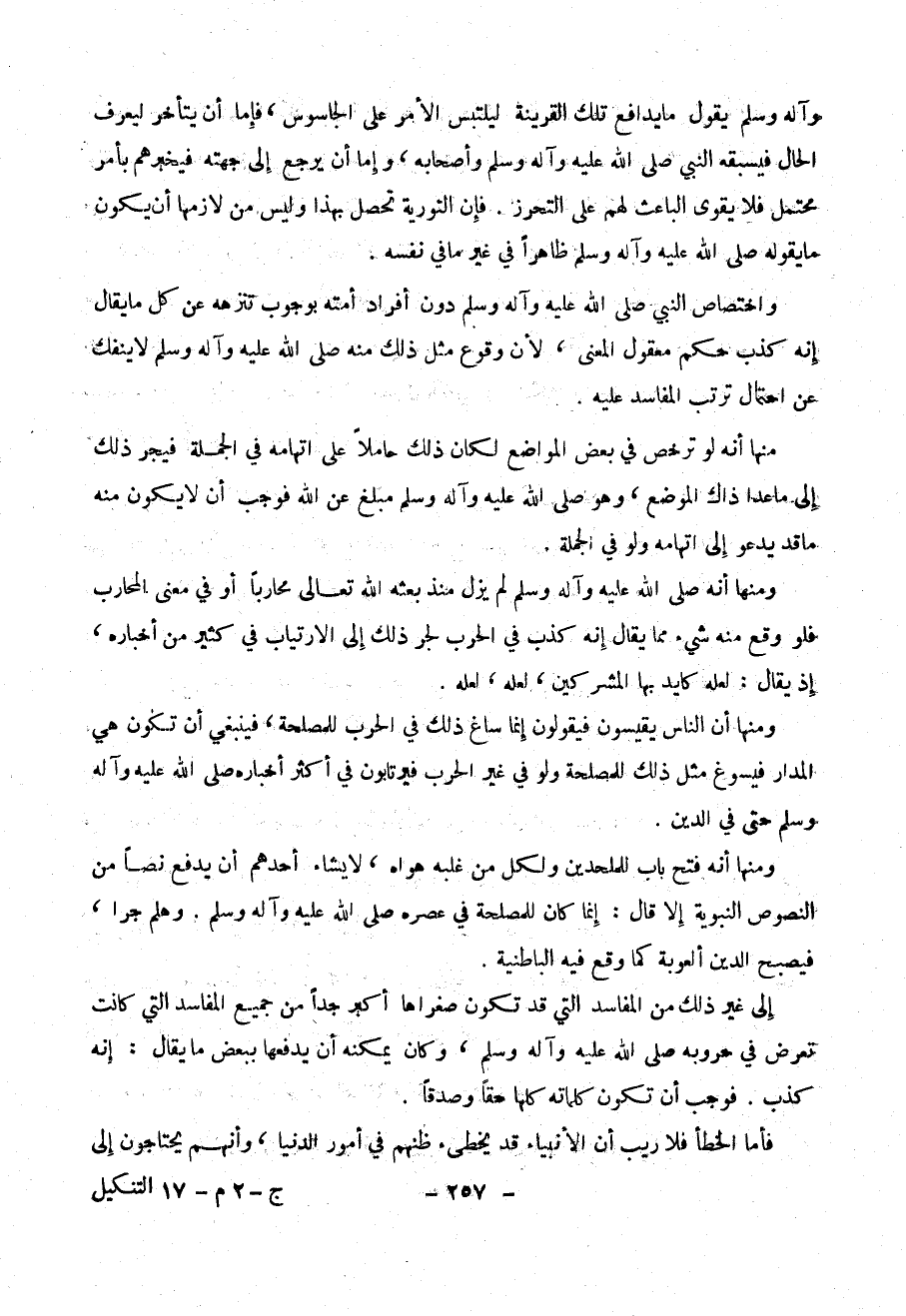 و منها أنه صلى الله عليه وآله وسلم لم يزل منذ بعثه الله تعالى محارباً أو في معنى المحارب فلو وقع منه شئ مما يقال إنه كذب في الحرب لجر ذلك إلى الارتياب في كثير من أخباره ، إذ يقال : لعله كايد بها المشركين ، لعله ، لعله .