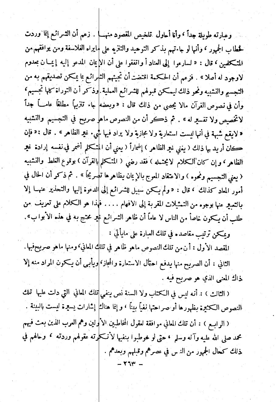 و عباراته طويلة جداً ، وأنا أحاول المقصود أحاول تلخيص المقصود منها . زعم أن الشرائع إنما وردت لخطاب الجمهور ، أنها لو جائتهم بذكر التوحيد والتنزيه على ما يراه الفلاسفة ومن يوافقهم من المتكلمين ، قال : (( لسارعوا إلى العناد أو أتفقوا على أن الإيمان المدعو إليه لإيمان بمعدوم لا وجود له أصلا )) . فزعم أن الحكمة اقتضت أن تجيئهم الشرائع بما يمكن تصديقهم به من التجسيم والتشبيه ونحو ذلك ليمكن قبولهم للشرائع العملية . وذكر أن التوراة كلها تجسيم وأن في نصوص القرآن ما لا يحصى من ذلك قال: (( وبعضه جاء تنيهاً مطلقاً عاماً جداً لا تخصيص ولا تفسير له )) . ثم ذكر أن من النصوص ما هو صريح في التجسيم والتشبيه (( ولا يقع شبهة في أنها ليست استعارية ولا مجازية ولا يراد فيها شئ غير الظاهر )) . قال : (( فإن كان أريد بها ذلك ( يغني غير الظاهر ) إضماراً ( يعني أن المتكلم أضمر في نفسه إرادة غير الظاهر ، وإن كان الكلام لا يحتمله ) فقد رضي ( المتكلم بالقرآن ) بوقوع الغلط والتشبيه ( يعني التجسيم ونحوه ) والاعتقاد المعوج بالإيمان يظاهرها تصريحاً )) . ثم ذكر أن الحال في أمور المعاد كذلك ، قال: (( ولم يكن سبيل للشرائع إلى الدعوة إليها والتحذير عنها إلا بالتعبير عنها بوجود من التمثيلات المقربة إلى الافهام ... . فهذا هو الكلام على تعريف من طلب أن يكون خصاً من الناس لا عاماً أن ظاهر الشرائع غير محتج به في هذه الأبواب )) .
