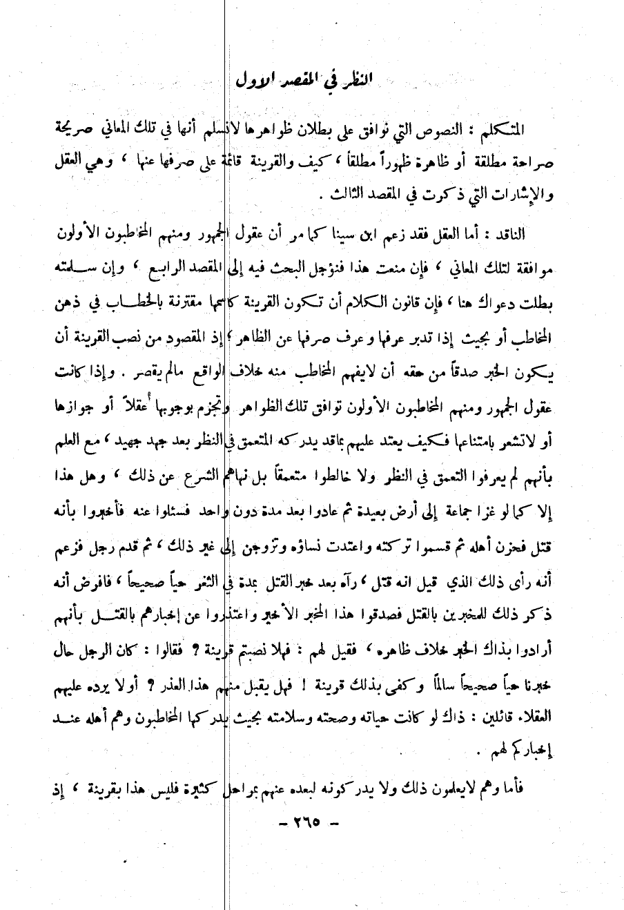 الناقد : أما العقل فقد زعم ابن سينا كما مر أن عقول الجمهور ومنهم المخاطبون الأولون موافقة لتلك المعاني ، فإن منعت هذا فنؤجل البحث فيه إلى المقصد الرابع ، وإن سلمته بطلت دعواك هنا ، فإن قانون الكلام أن تكون القرينة كاسمها مقترنة بالخطاب في ذهن المخاطب أو بحيث إذا تدبر عرفها وعرف صرفها عن الظاهر ، إذ المقصود عن نصب القرينة أن يكون الخبر صدقاً من حقه أن لا يفهم المخاطب منه خلاف الواقع ما لم يقصر . وإذا كانت عقول الجمهور ومنهم المخاطبون الأولون توافق تلك الظواهر وتجزم بوجوبها عقلاً أو جوازاً أو لا تشعر بامتناعها فكيف يعتد عليهم بما قدر يدركه المتعمق في النظر بعد جهد جهيد ، مع العلم بأنهم لم يعرفوا التعمق في النظر ولا خالطوا متعمقاً بل نهاهم الشرع عن ذلك ، وهل هذا إلا كما لو غزا جماعة إلى أرض بعيدة ثم عادوا بعد مدة دون واحد فسئلوا عنه فأخبروه بأنه قتل فحزن أهله ثم قسموا تركته واعتدت نساؤه وتزوجن إلى غير ذلك ، ثم قدم رجل فزعم أنه رأى ذلك الذي قيل انه قتل ، رآه بعد خبر القتل بمدة في الثغر حياً صحيحاً ، فافرض أنه ذكر ذلك للمخبرين بالقتل فصدقوا هذا المخبر الأخير واعتذروا عن أخبارهم بالقتل بأنهم أرادوا بذاك الخبر خلاف ظاهره ، فقيل لهم : فهلا نصبتم قرينة ؟ فقالوا : كان الرجل حال خبرنا حياً صحيحاً سالماً وكفى بذلك قرينة ! فهل يقبل منهم هذا العذر ؟ أولا يرده عليهم العقلاء قائلين : ذاك لو كانت حياته وصحته وسلامته بحيث يدركها المخاطبون وهم أهله عند إخباركم لهم .