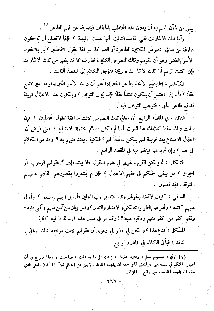 الناقد : في المقصد الرابع أن معاني تلك النصوص كانت موافقة لعقول المخاطبين، فإن سلمت ذلك سقط كلامك هنا لثبوت أنها لم تكن عندهم محتملة للامتناع ، فعلى فرض أن احتمل الامتناع يعد قرينة فلم يكن حاصلاً لهم ، فكيف يعتد عليهم به ؟ وقد مر الكلام في هذا ، وإن لم يسلم فينظر فيه في المقصد الرابع .