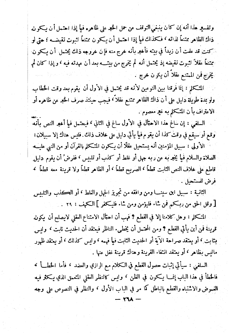 السلفي: سيأتي إثبات حصول القطع في الكلام مع الرازي والعضد، فأما الخطأ، فالخطأ في الباب إنما يكون في الظن، وليس كالنظر العقلي المتعمق الذي يكثر فيه الغموض والاشتباه والقطع بالباطل كما مر في الباب الأول، والنظر في النصوص على وجه