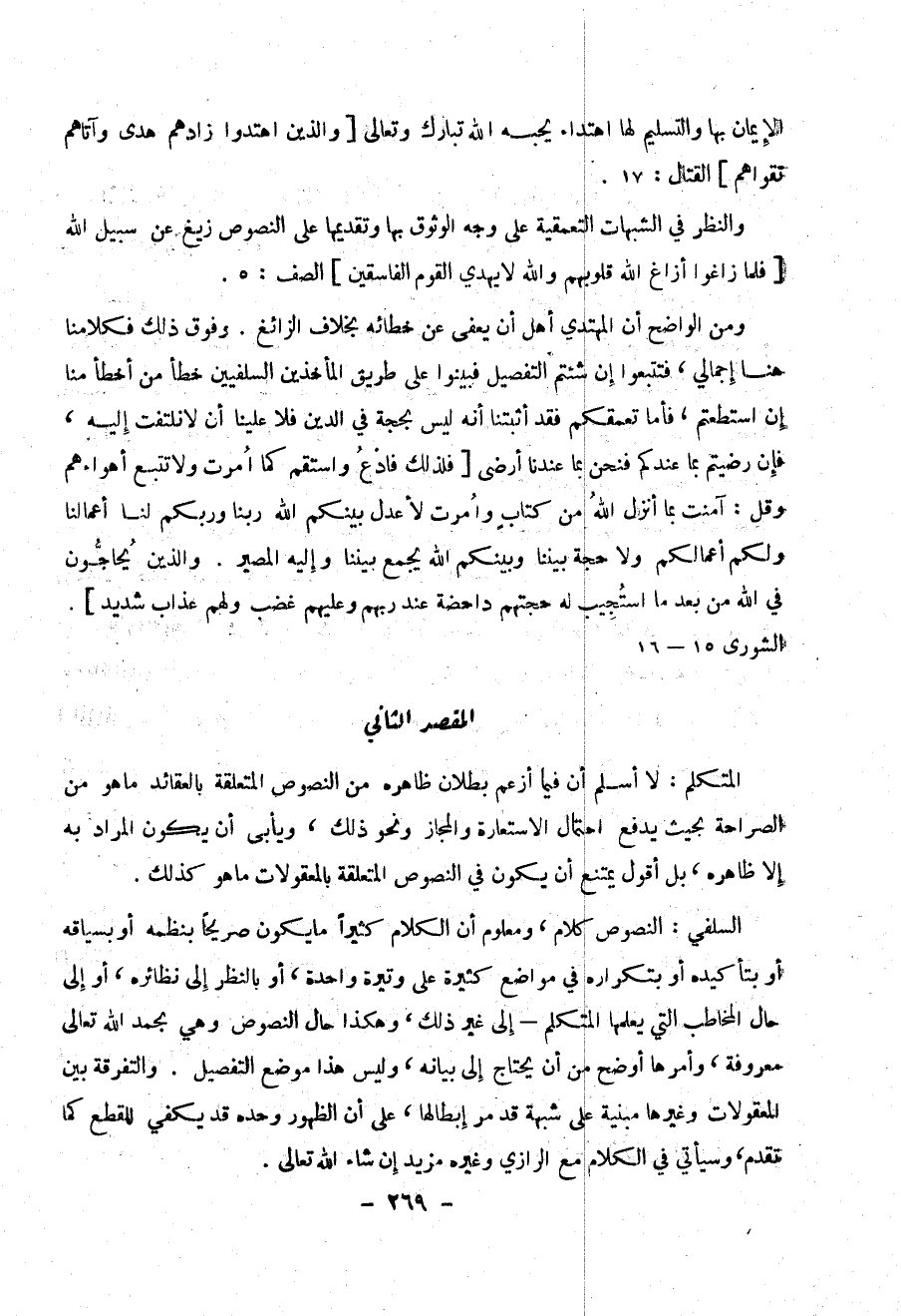 السلفي : النصوص كلام ، ومعلوم أن الكلام كثيراً ما يكون صريحاً بنظمه أو بسياقه أو بتأكيده أو بتكراره في مواضع كثيرة على وتيرة واحدة ، او بالنظر إلى نظائره ، أو إلى حال المخاطب التي يعلمها المتكلم – إلى غير ذلك ، وهكذا حال النصوص وهي بحمد الله تعالى معروفة ، وأمرها أوضح من أن يحتاج إلى بيانه ، وليس هذا موضع التفصيل . والتفرقة بين المعقولات وغيرها مبنية على شبهة قد مر إبطالها ، على أن الظهور وحده قد يكفي للقطع كما تقدم ، وسيأتي في الكلام مع الرازي وغيره مزيد إن شاء الله تعالى .