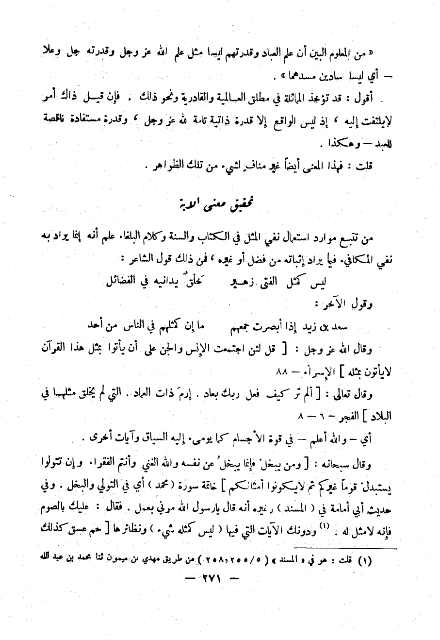 و قال سبحانه : [)هَا أَنْتُمْ هَؤُلاءِ تُدْعَوْنَ لِتُنْفِقُوا فِي سَبِيلِ اللَّهِ فَمِنْكُمْ مَنْ يَبْخَلُ وَمَنْ يَبْخَلْ فَإِنَّمَا يَبْخَلُ عَنْ نَفْسِهِ وَاللَّهُ الْغَنِيُّ وَأَنْتُمُ الْفُقَرَاءُ وَإِنْ تَتَوَلَّوْا يَسْتَبْدِلْ قَوْماً غَيْرَكُمْ ثُمَّ لا يَكُونُوا أَمْثَالَكُمْ ] خاتمة سورة ( محمد ) أي في الولي والبخل . وفي حديث أبي أمامة في ( المسند ) وغيره أنه قال يا رسول الله مرني بعمل . فقام : عليك بالصوم فإنه لا مثل له . (1)و دونك الآيات التي فيها ( ليس كمثله شئ ) ونظائرها [حم عسق . كَذَلِكَ