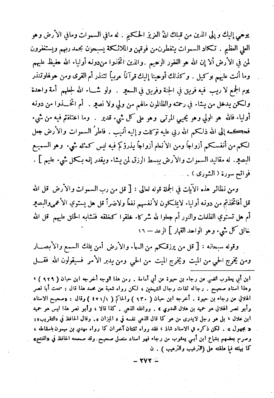يُوحِي إِلَيْكَ وَإِلَى الَّذِينَ مِنْ قَبْلِكَ اللَّهُ الْعَزِيزُ الْحَكِيمُ . لَهُ مَا فِي السَّمَاوَاتِ وَمَا فِي الْأَرْضِ وَهُوَ الْعَلِيُّ الْعَظِيمُ . تَكَادُ السَّمَاوَاتُ يَتَفَطَّرْنَ مِنْ فَوْقِهِنَّ وَالْمَلائِكَةُ يُسَبِّحُونَ بِحَمْدِ رَبِّهِمْ وَيَسْتَغْفِرُونَ لِمَنْ فِي الْأَرْضِ أَلا إِنَّ اللَّهَ هُوَ الْغَفُورُ الرَّحِيمُ . وَالَّذِينَ اتَّخَذُوا مِنْ دُونِهِ أَوْلِيَاءَ اللَّهُ حَفِيظٌ عَلَيْهِمْ وَمَا أَنْتَ عَلَيْهِمْ بِوَكِيلٍ . وَكَذَلِكَ أَوْحَيْنَا إِلَيْكَ قُرْآناً عَرَبِيّاً لِتُنْذِرَ أُمَّ الْقُرَى وَمَنْ حَوْلَهَا وَتُنْذِرَ يَوْمَ الْجَمْعِ لا رَيْبَ فِيهِ فَرِيقٌ فِي الْجَنَّةِ وَفَرِيقٌ فِي السَّعِيرِ . وَلَوْ شَاءَ اللَّهُ لَجَعَلَهُمْ أُمَّةً وَاحِدَةً وَلَكِنْ يُدْخِلُ مَنْ يَشَاءُ فِي رَحْمَتِهِ وَالظَّالِمُونَ مَا لَهُمْ مِنْ وَلِيٍّ وَلا نَصِيرٍ . أَمِ اتَّخَذُوا مِنْ دُونِهِ أَوْلِيَاءَ فَاللَّهُ هُوَ الْوَلِيُّ وَهُوَ يُحْيِي الْمَوْتَى وَهُوَ عَلَى كُلِّ شَيْءٍ قَدِيرٌ . وَمَا اخْتَلَفْتُمْ فِيهِ مِنْ شَيْءٍ فَحُكْمُهُ إِلَى اللَّهِ ذَلِكُمُ اللَّهُ رَبِّي عَلَيْهِ تَوَكَّلْتُ وَإِلَيْهِ أُنِيبُ . فَاطِرُ السَّمَاوَاتِ وَالْأَرْضِ جَعَلَ لَكُمْ مِنْ أَنْفُسِكُمْ أَزْوَاجاً وَمِنَ الْأَنْعَامِ أَزْوَاجاً يَذْرَأُكُمْ فِيهِ لَيْسَ كَمِثْلِهِ شَيْءٌ وَهُوَ السَّمِيعُ الْبَصِيرُ . لَهُ مَقَالِيدُ السَّمَاوَاتِ وَالْأَرْضِ يَبْسُطُ الرِّزْقَ لِمَنْ يَشَاءُ وَيَقْدِرُ إِنَّهُ بِكُلِّ شَيْءٍ عَلِيمٌ ] .