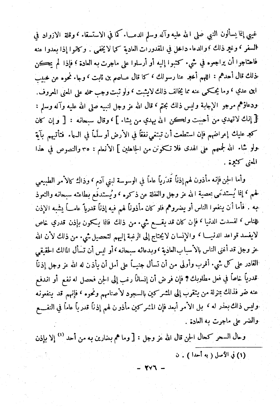 و أما الجن فأنه مأذون لهم أذناً قدرياً عاماً في الوسوسة لبني آدم ، وذاك كالأمر الطبيعي لهم ، إما يستدعي بمعصية الله عز وجل والغفلة عن ذكره ، ويستدفع بطاعته سبحانه والتعوذ به . فأما ان ينفعوا الناس أو يضروهم فلو كان مأذوناً لهم فيه أذناً قدرياً عاماً يشبه الأذن للناس ، لفسدت الدنيا ، فإن كان قد يقع شيء من ذلك فإنما يكون بأذن قدري خاص لا يفسد قواعد الدنيا ، والإنسان لا يحتاج إلى الرغبة إليهم لتحصيل شيء من ذلك لأن الله عز وجل قد أغنى الناس بالأسباب العادية ، وبدعائه سبحانه ، أو ليس أن تسأل المالك الحقيقي القادر على كل شيء أقرب وأولى من أن تسأل جنياً على أمل أن يأذن له الله عز وجل إذناً قدرياً خاصاً في فعل مطلوبك ؟ فإن فرض أن إنساناً رغب إلى الجن فحصل له نفع أو أندفع عنه ضر فذلك بمنزلة من يتقرب إلى المشركين بالسجود لأصنامهم ونحوه ، فإنهم قد ينفعونه وليس ذلك بعذر له ، بل الأمر أبعد فإن المشركين مأذون لهم إذناً قدرياً عاماً في النفع والضر على ما جرت به العادة .