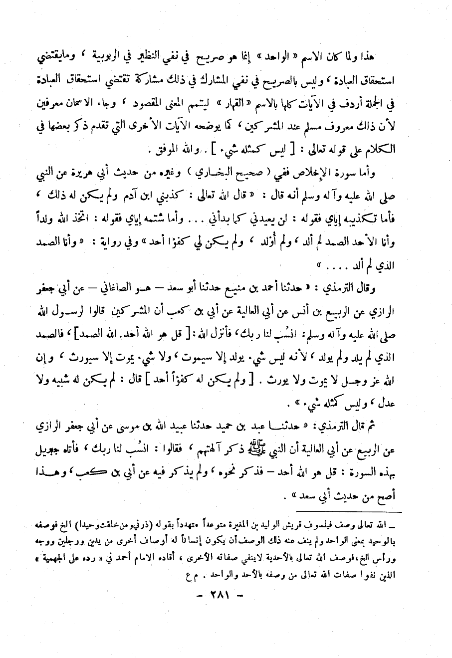 – هو الصاغاني – عن أبي جعفر الرازي عن الربيع عن أنس عن أبي العالية عن أبي بن كعب أن المشركين قالوا لرسول الله صلى الله عليه وآله وسلم : انسُب لنا ربك ، فأنزل الله : [ قُلْ هُوَ اللَّهُ أَحَدٌ . اللَّهُ الصَّمَدُ ] ، فالصمد الذي لم يلد ولم يولد ، لأنه ليس شئ يولد إلا سيموت ، ولا شئ يموت إلا سيورث ، وإن الله عز وجل لا يموت ولا يورث . [ وَلَمْ يَكُنْ لَهُ كُفُواً أَحَدٌ ] قال : لم يكن له شبيه ولا عدل ، وليس كمثله شئ )) .