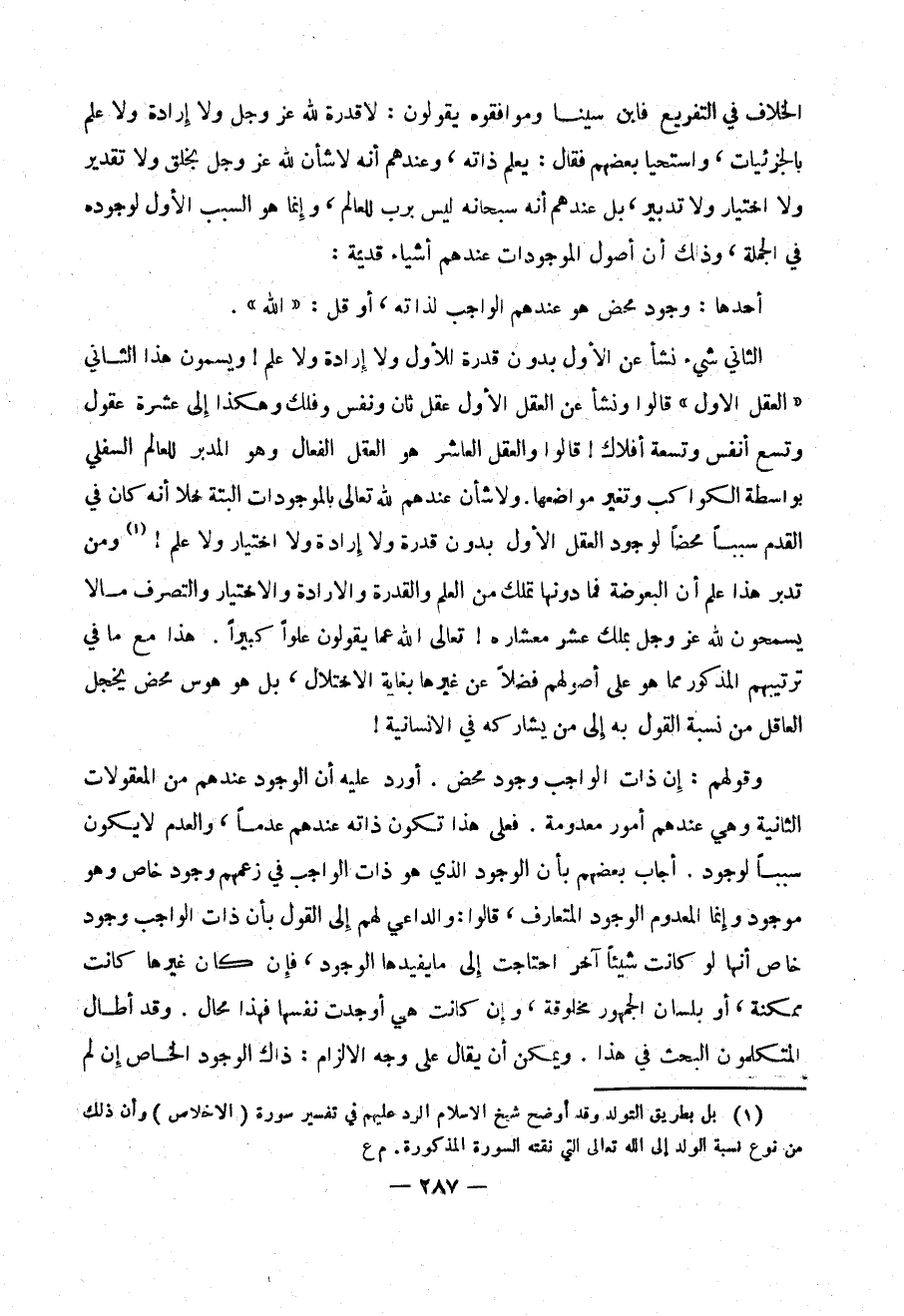 الثاني شيء نشأ عن الأول بدون قدرة للأول ولا إرادة ولا علم ! ويسمون هذا الثاني (( العقل الأول )) قالوا ونشأ عن العقل الأول عقل ثان ونفس وفلك وهكذا إلى عشرة عقول وتسع أنفس وتسعة أفلاك ! قالوا والعقل العاشر هو العقل الفعال وهو المدبر للعالم السلفي بواسطة الكواكب وتغير مواضعها . وشأن عندهم لله تعالى بالموجودات البتة خلا أنه كان في القدم سبباً محضاً لوجود العقل الأول بدون قدرة ولا إرادة ولا اختيار ولا علم ! (1) ومن تدبر هذا علم أن البعوضة تملك من العلم والقدرة والإرادة والاختيار والتصرف مالا يسمحون لله عز وجل بلمك عشر معشاره ! تعالى الله عما يقولون علواً كبيراً . هذا مع ما في ترتيبهم المذكور على أصولهم فضلاً عن غير الاختلال ، بل هو هوس يخجل العاقل من نسبة القول به إلى من يشاركه في الانسانية !