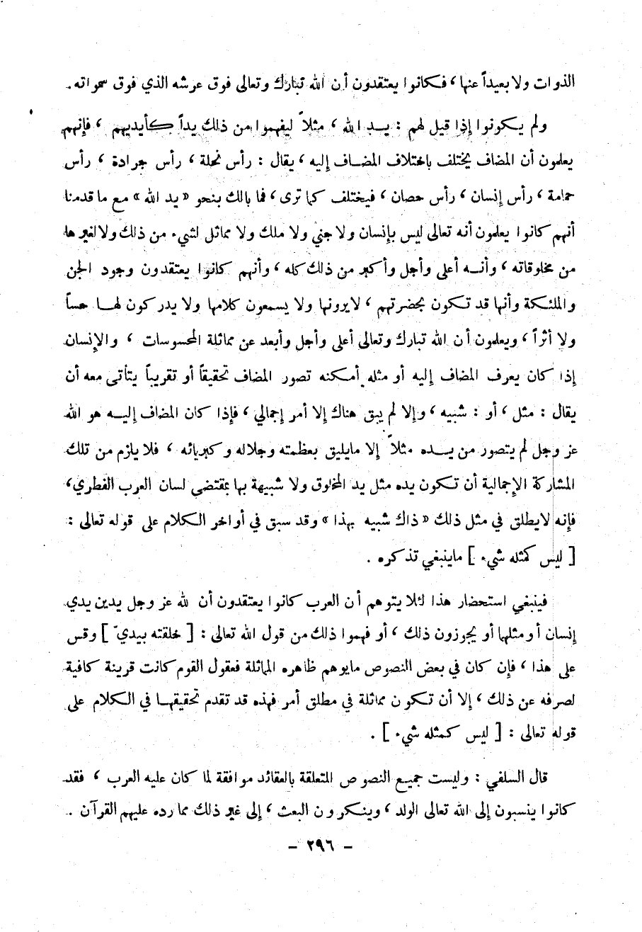 و لم يكونوا إذا قيل لهم : يد الله ، مثلاً ليفهموا من ذلك يداً كأيديهم ، ، فإنهم يعلمون أن المضاف يختلف باختلاف المضاف إليه ، يقال : رأس جرادة ، رأس حمامة ، رأس إنسان ، رأس حصان ، فيختلف كما ترى ، فما بالك بنحو (( يد الله )) مع ما قدمنا انهم كانوا يعلمون أنه تعالى ليس بإنسان ولا جني ولا ملك ولا مماثل لشيء من ذلك ولا لغيرها من مخلوقاته ، وانه أعلى وأجل وأكبر من ذلك كله ، وأنهم كانوا يعتقدون وجود الجن والملئكة وأنها قد تكون بحضرتهم ، لا يرونها ولا يسمعون كلامها ولا يدركون لها حساً ولا أثراً ، ويعلمون أن الله تبارك وتعالى أعلى وأجل وأبعد عن مماثلة المحسوسات ، والإنسان إذا كان يعرف المضاف إليه أو مثله أمكنه تصور المضاف تحقيقاً أو تقريباً يتأتى معه أن يقال : مثل ، أو شبيه ، ولم يبق هناك إلا إجمالي ، فإذا كان المضاف إليه هو الله عز وجل لم يتصور من يده مثلاً إلا ما يليق بعظمته وجلاله وكبريائه ، فلا يلزم من تلك المشاركة الإجمالية أن تكون يده مثل المخلوق ولا شبيهة بها بمقتضى لسان العرب الفطري ، فإنه لا يطلق في مثل ذلك (( ذاك شبيه بهذا )) وقد سبق في أواخر الكلام على قوله تعالى : [ ليس كمثله شئ ] ما ينبغي تذكره .