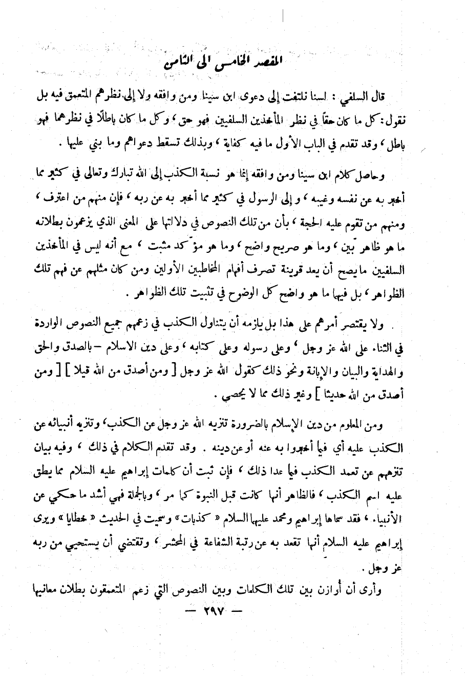 و حاصل كلام ابن سينا ومن وافقه إنما هو نسبة الكذب إلى الله تبارك في كثير مما أخبر به عن نفسه وغيبه، وإلى الرسول في كثير مما أخبر به عن ربه، فإن منهم من اعترف، ومنهم من تقوم عليه الحجة، بأن من تلك النصوص في دلالتها على المعنى الذي يزعمون بطلانه ما هو ظاهر بين، وما هو صريح واضح، وما هو مؤكد مثبت، مع أنه ليس في المأخذين السلفيين ما يصح أن قرينة تصرف أفهام المخاطبين الأولين من كان مثلهم عن فهم تلك الظواهر، بل فيها ما هو واضح كل الوضوح بل، فيها ما هو واضح كل الوضوح في تثبيت تلك الظواهر.