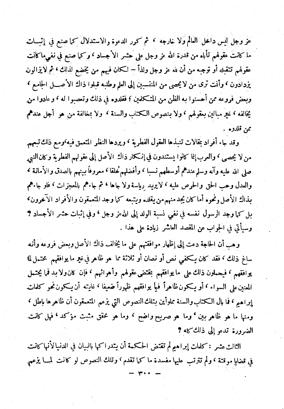 و هب أن الحاجة دعت إلى إظهار موافقتهم على ما يخالف ذاك الأصل وبعض فروعه وأنه ساغ ذلك ، فقد كان يكفي نص أو نصان أو ثلاثة مما هو ظاهر في غير ما يوافقهم محتمل لما يوافقهم ، فيحملون ذلك على ما يوافقهم وأهوائهم ، فإن كان ولابد فما يحتمل المعنيين على السواء ، أو يكون ظاهراً فيما يوافقهم ظهوراً ضعيفاً ، غايته أن يكون نحو كلمات إبراهيم ، فما بال الكتاب والسنة مملوأين بتلك النصوص التي يزعم المتعمقون أن ظاهرها باطل ، ومنها ما ظاهر بين ، وما هو صريح واضح ، وما هو واضح ، وما هو محقق مثبت مؤكد ، فهل كانت الضرورة تدعوة إلى ذلك كله ؟