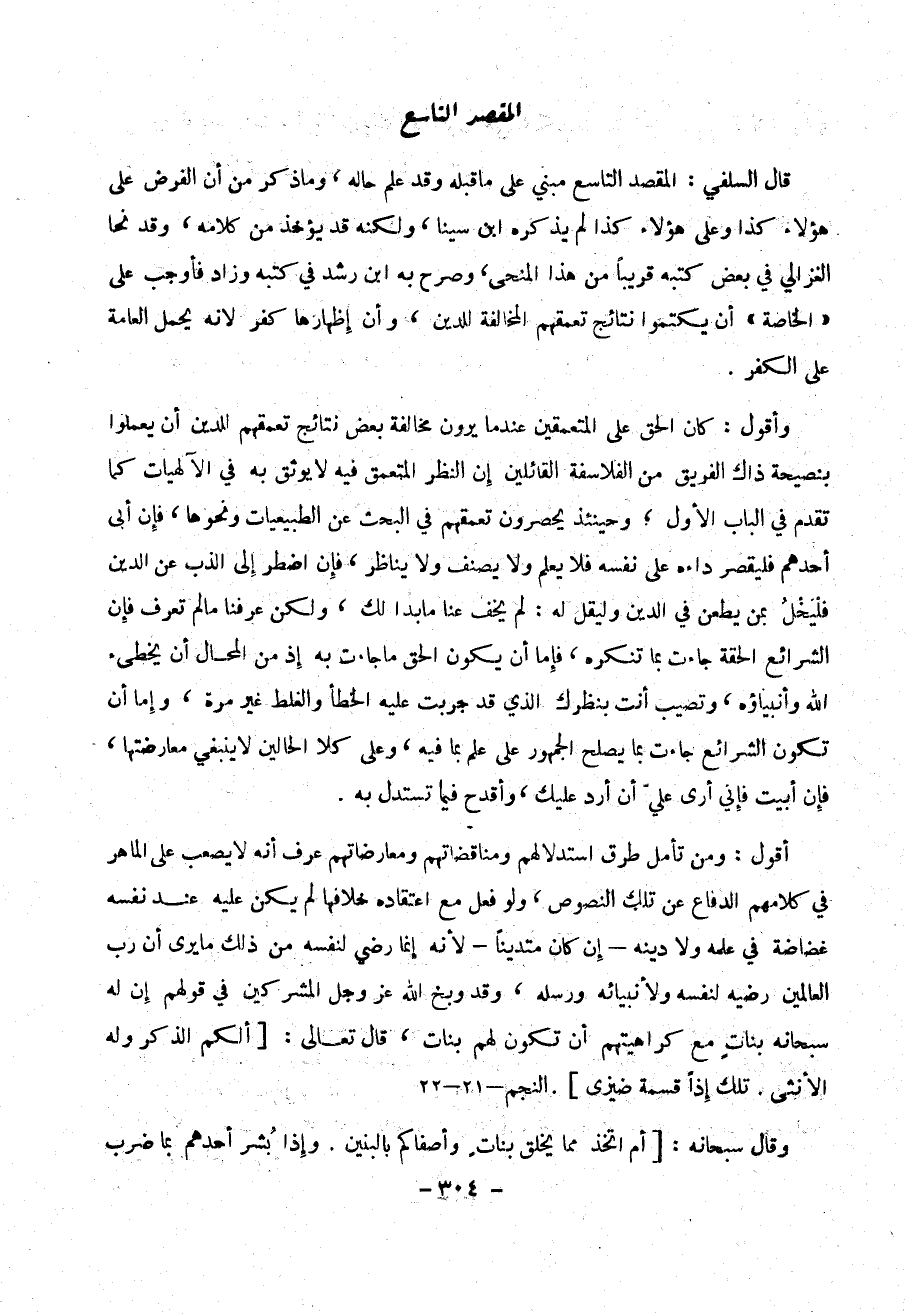 قال السلفي: المقصد التاسع مبني على ما قبله وقد علم حاله، وما ذكر من أن الفرض على هؤلاء كذا وعلى هؤلاء كذا لم يذكره ابن سينا، ولكنه قد يؤخذ من كلامه، وقد نحا الغزالي في بعض كتبه قريباً من هذا المنحي، وصرح به ابن رشد في كتبه وزاد فأوجب على ((الخاصة)) أن يكتموا نتائج تعمقهم المخالفة للدين، وإن إظهارها كفر أنه يحمل العامة على الكفر.