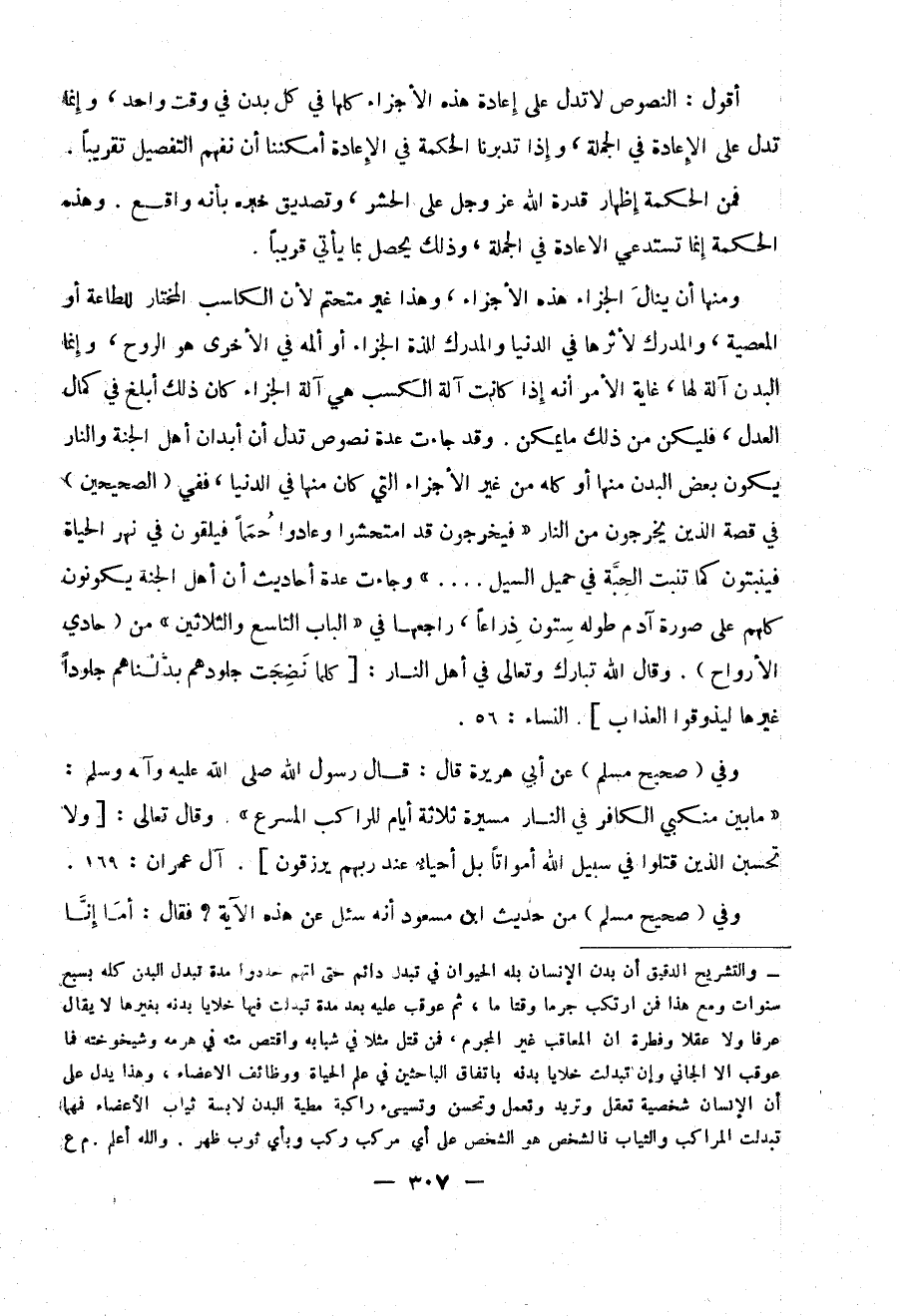 ومنها أن ينال الجزاء هذه الأجزاء، وهذا غير متحتم لأن الكاسب المختار للطاعة أو المعصية، والمدرك لأثرها في الدنيا والمدرك للذة الجزاء أو ألمه في الآخرة هو الروح، وإنما البدن آلة لها، غاية الأمر أنه إذا كانت آلة الكسب هي آلة الجزاء كان ذلك أبلغ في كمال العدل فليكن من ذلك ما يمكن. وقد جاءت عدة نصوص تدل أن أبدان أهل الجنة والنار يكون بعض البدن منها أو كله من غير الأجزاء التي كانت منها في الدنيا، ففي (الصحيحين) في قصة الذين يخرجون من النار ((فيخرجون قد أمتحشوا وعادوا حمماً فيلقون في نهر الحياة فينبتون كما تنبت الحبة في حميل السيل ... .)) وجاءت عدة أحاديث أن أهل الجنة يكونون كلهم على صورة آدم طوله ستون ذراعاً، راجعها في ((الباب التاسع والثلاثين)) من (حادي الأرواح). وقال تبارك وتعالى في أهل النار [كُلَّمَا نَضِجَتْ جُلُودُهُمْ بَدَّلْنَاهُمْ جُلُوداً غَيْرَهَا لِيَذُوقُوا الْعَذَابَ]. النساء: 56.