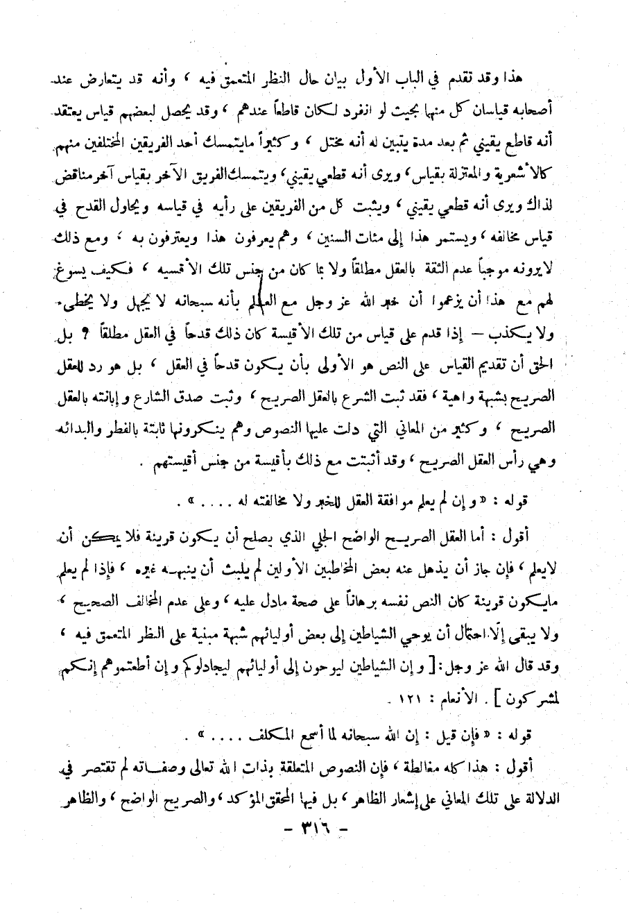 هذا وقد تقدم في الباب الأول بيان حال النظر المتعمق فيه، وأنه قد يتعرض عند أصحابه قياسان كل منهما بحيث لو أنفرد لكان قاطعاً عندهم، وقد يحصل لبعضهم قياس يعتقد أنه قاطع يقيني ثم بعد مدة يتبين له أنه مختل، وكثيراً ما يتمسك أحد الفريقين المختلفين منهم كالأشعرية والمعتزلة بقياس، ويرى أنه قطعي يقيني، ويتمسك الفريق الآخر بقياس آخر مناقض لذلك ويرى أنه قطعي يقيني، ويثبت كل الفريقين على رأيه في قياسه يحاول القدح في قياس مخالفه، ويستمر هذا إلى مئات السنين، وهم يعرفون هذا ويعترفون به، مع ذلك لا يرونه موجباً عدم الثقة بالعقل مطلقاً ولا بما كان من جنس تلك الأقيسة، فكيف يسوغ لهم مع هذا أن يزعموا أن خبر الله عز وجل مع العلم بأنه سبحانه لا يجهل ولا يخطئ ولا يكذب - إذا قدم على قياس تلك الأقيسة كان ذلك قدحاً في العقل مطلقاً؟ بل الحق أن تقديم القياس على النص هو الأولى بأن يكون قدحاً في العقل، بل هو رد للعقل الصريح بشبهة واهية، فقد ثبت الشرع بالعقل الصريح وثبت صدق الشارع وإبانته بالعقل الصريح، وكثير من المعاني التي دلت عليها النصوص وهم ينكرونها ثابتة بالفطر والبدائة وهي رأس العقل الصريح، وقد أبتت مع ذلك بأقيسة من جنس أقيستهم.