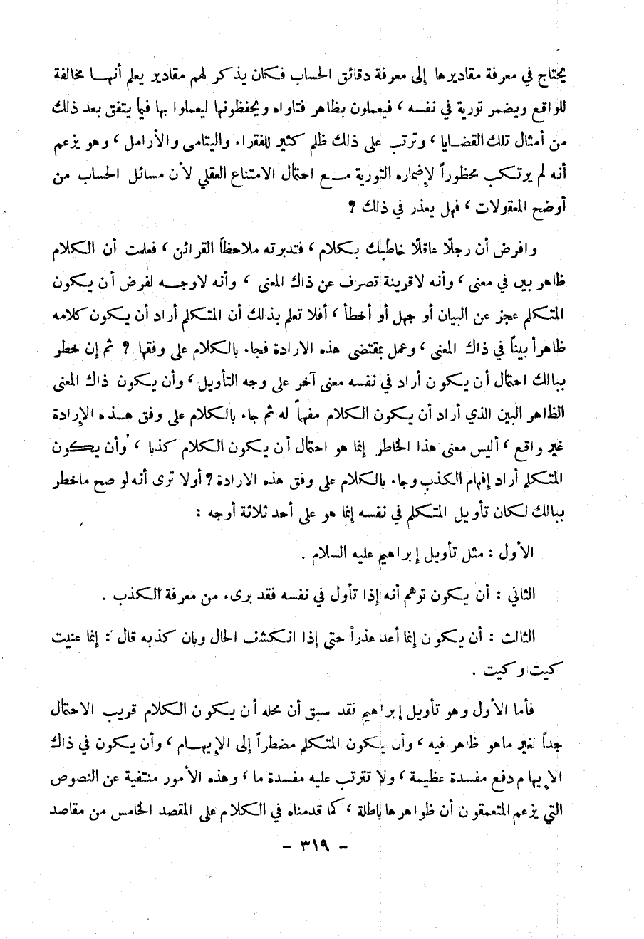و افرض أن رجلاً عاقل خاطبك بكلام ، فتدبرته ملاحظاً القرائن ، فعلمت أن الكلام ظاهر بين في معنى ، وأنه لا قرينة تصرف عن ذاك المعنى ، وأنه لا وجه لفرض أن يكون المتكلم عجز عن البيان أو جهل أو أخطأ ، أفلا تعلم ذلك بأن المتكلم أراد أن يكون كلامه ظاهراً بيناً في ذاك المعنى ، وعمل بمقتضى هذه الإرادة فجاء بالكلام على وفقها ؟ ثم أن خطر ببالك احتمال أن يكون أراد في نفسه معنى آخر على وجه التأويل ، وأن يكون ذاك المعنى الظاهر البين الذي أراد أن يكون الكلام مفهماً له ثم جاء بالكلام على وفق من هذه الإرادة غير واقع ، أليس معنى هذا الخاطر إنما هو احتمال أن يكون الكلام كذباً ، وإن يكون ببالك لكان تأويل المتكلم في نفسه إنما هو على أحد ثلاثة أوجه :