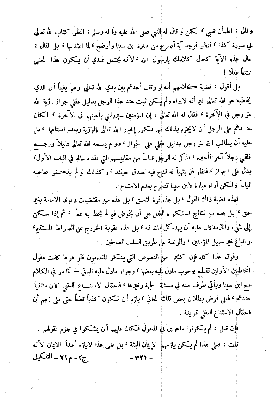 و قال: اطمأن قلبي، لكن لو قال له النبي صلى الله عليه وآله وسلم: انظر كتاب الله تعالى في سورة كذا، فنظر فوجد آية أصرح من عبارة ابن سينا وأوضح، لما أعتد بها، بل لقال: حال هذه الآية كحال كلامك يا رسول الله، لأنه يحتمل عندي أن يكون هذا المعنى ممتنعاً عقلاً!