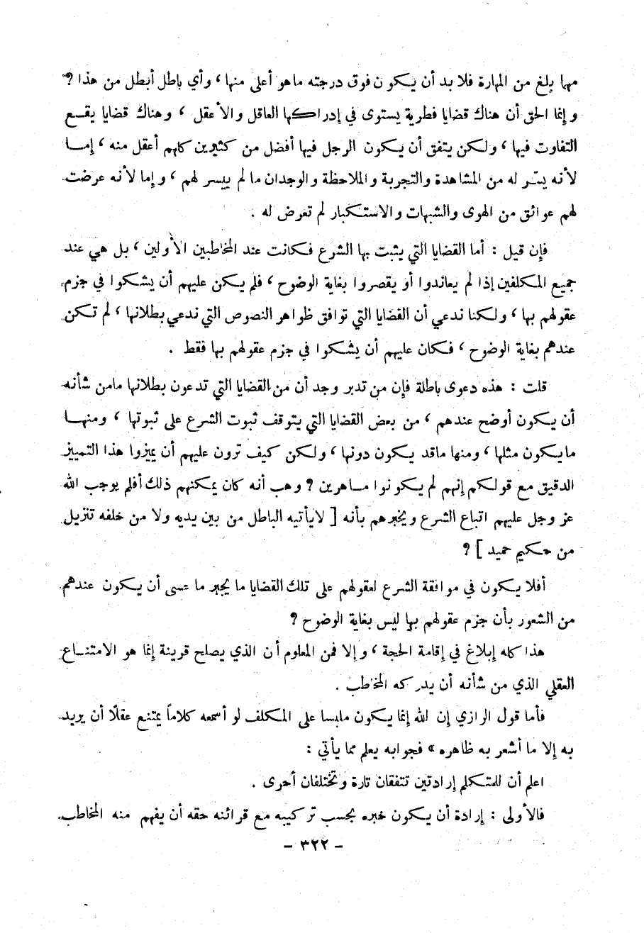 قلت : هذه دعوى باطلة فإن من تدبير وجد أن من القضايا التي تدعون بطلانها ما من شأنه أن يكون أوضح عندهم ، من بعض القضايا التي يتوقف ثبوت الشرع على ثبوتها ، ومنها ما يكون مثلها ، ومنها ما قد يكون دومنها ، ولكن كيف ترون عليهم أن يميزوا هذا التمييز الدقيق مع قولكم إنهم لم يكونوا ماهرين ؟ وهب أنه كن يمكنهم ذلك أفلم يوجب الله عز وجل عليهم اتباع الشرع ويخبرهم بأنه [ لا يَأْتِيهِ الْبَاطِلُ مِنْ بَيْنِ يَدَيْهِ وَلا مِنْ خَلْفِهِ تَنْزِيلٌ مِنْ حَكِيمٍ حَمِيدٍ ] ؟