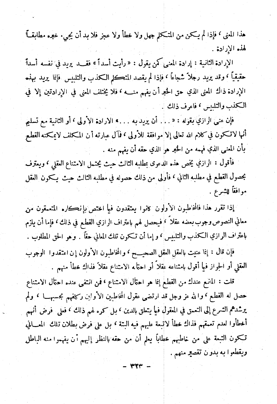 فإن عنى الرازي بقوله : (( ... أن يريد به ... )) الإرادة الأولى ، أو الثانية مع تسليم لأنها لا تكون في كلام الله تعالى إلا موافقة للأولى ، فمآل عبارته أن المكلف لا يمكنه القطع بأن المعنى الذي فهمه من الخبر هو الذي حقه أن يفهم منه .