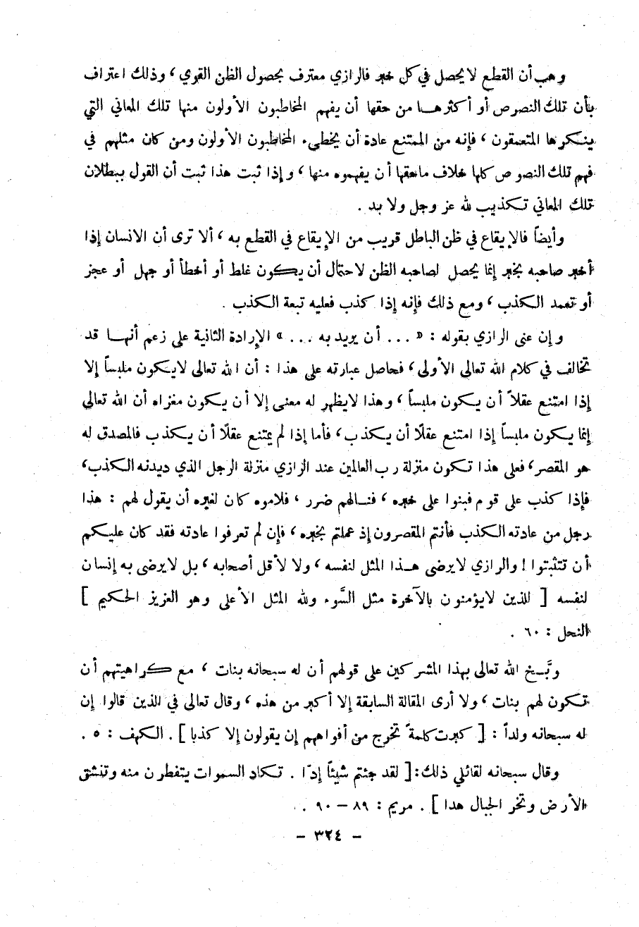 وهب أن القطع لا يحصل في كل خبر فالرازي معترف بحصول الظن القوي ، وذلك اعتراف بأن تلك النصوص أو أكثرها مت حقها أن يفهم المخاطبون الأولون منها تلك المعاني التي ينكرها المتعمقون ، فإن من الممتنع عادة أن يخطئ المخاطبون الأولون ومن كان مثلهم في فهم تلك النصوص كلها خلاف ما حقها أن يفهموه منها ، وإذ ثبت هذا ثبت أن القول ببطلان تلك المعاني تكذيب لله عز وجل ولا بد .