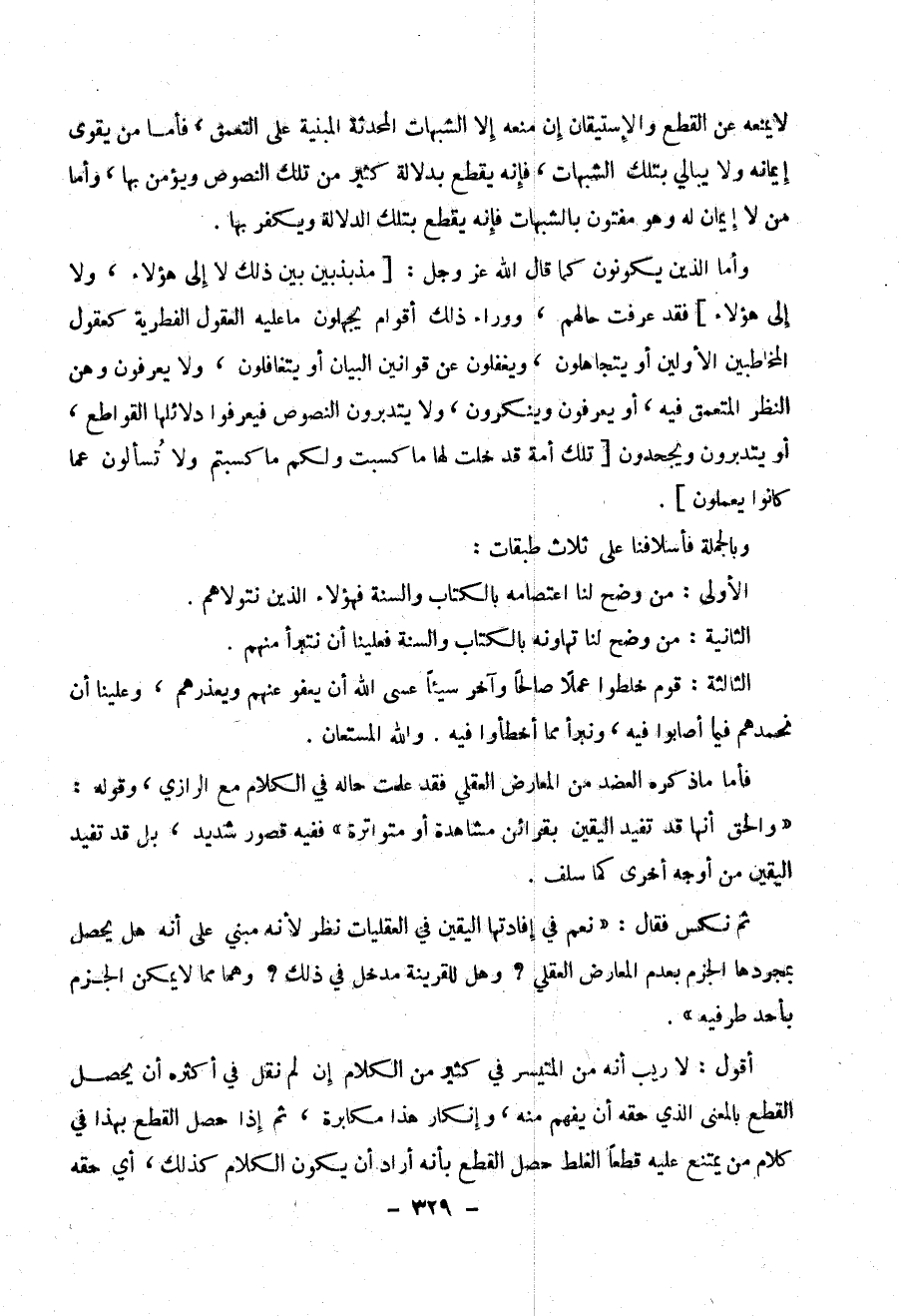 لا يمنعه عن القطع والإستيقان إن منعه إلا الشبهات المحدثة المبنية على التعمق ، فأما من يقوي إيمانه ولا يبالي بتلك الشبهات ، فإنه يقطع بدلالة كثير من تلك النصوص ويؤمن بها ، وأما من لا إيمان له وهو مفتون بالشبهات فإنه يقطع بتلك الدلالة ويكفر بها .
