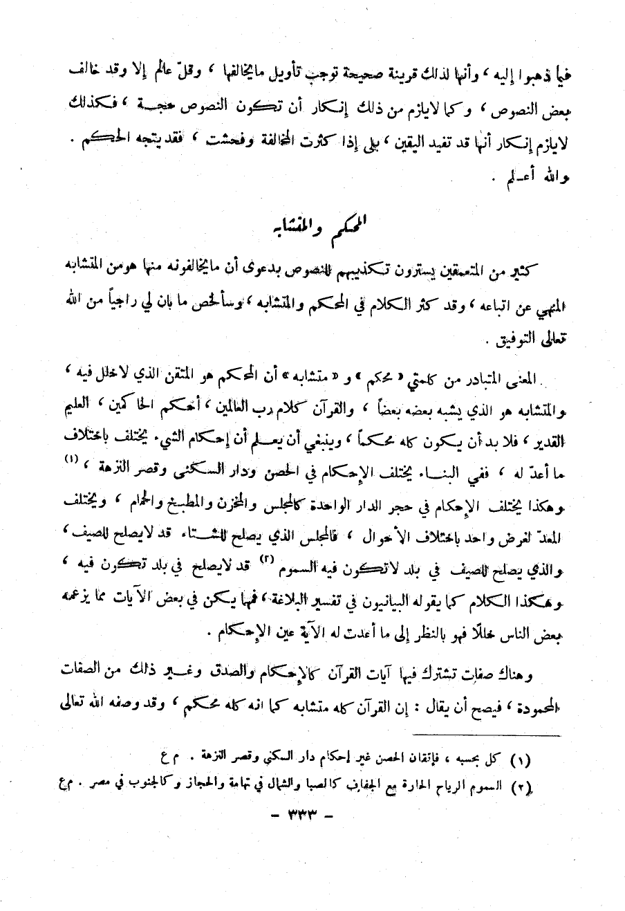 المعنى المتبادر إلى الذهن من كلمتي (( محكم )) و(( متشابه )) أن الحكم هو المتقن الذي لا خلل فيه ، والمتشابه هو الذي يشبه بعضه بعضاً ، والقرآن كلام رب العلمين ، أحكم الحاكمين ، العليم القدير ، فلابد أن يكون كله محكماً ، وينبغي أن يعلم إحكام الشئ يختلف باختلاف ما أعد له ، ففي البناء يختلف الإحكام في الحصن ودار السكنى وقصر النزهة ، (1) وهكذا يختلف الإحكام في حجر الدار الواحدة كالمجلس والمخزن والحمام ، ويختلف المعد لغرض واحد باختلاف الأحوال ، فالمجلس الذي يصلح للشتاء قد لا يصلح للصيف ، والذي يصلح للصيف في بلد لا تكون فيه السموم (2) قد لا يصلح في بلد تكون فيه ، وهكذا الكلام كما يقوله البيانيون في تفسير البلاغة، فمهما يكن في بعض الآيات مما يزعمه بعض الناس خللاً فهو بالنظر إلى ما أعدت له الآية عين الإحكام.و هناك صفات تشترك فيها آيات القرآن كالإحكام والصدق وغير ذاك من الصفات المحمودة ، فيصح أن يقال : إن القرآن كله متشابه كما أنه كله محكم ، وقد وصفه الله تعالى