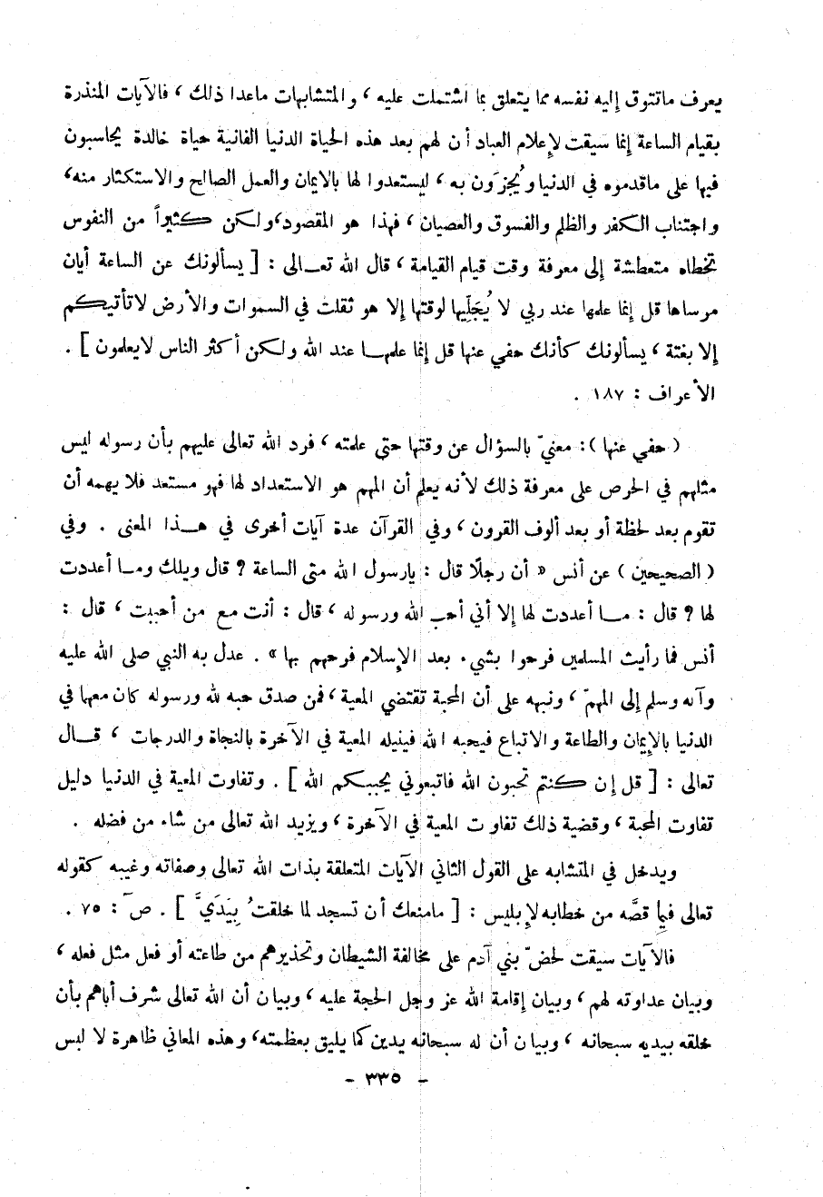 (حفي عنها ) : معني بالسؤال عن وقتها حتى علمته ، فرد الله تعالى عليهم بأن رسول ليس مثلهم في الحرص على معرفة ذلك لأنه يعلم أن المهم هو الإستعداد لها فهو مستعد فلا يهمه أن تقوم بعد لحظة أو بعد ألوف القرون ، وفي القرآن عدة آيات أخرى في هذا المعنى . وفي ( الصحيحين ) عن أنس (( أن رجلاً قال : يار رسول الله متى الساعة؟ قال ويلك وما أعددت لها ؟ قال : ما أعددت لها إلا أني أحب الله ورسوله ، قال أنت مع من أحببت ، قال : أنس فما رأيت المسلمين فرحوا بشئ بعد الإسلام فرحهم بها )) . عدل به النبي صلى الله عليه وآله وسلم إلى المهم ، ونبهه على أن المحبة تقتضي المعينة ، فمن صدق حبه لله ورسوله كان معها في الدنيا بالإيمان والطاعة والاتباع فيحبه الله فينيله المعية في الآخرة بالنجاة والدرجات ، قال تعالى : [ قُلْ إِنْ كُنْتُمْ تُحِبُّونَ اللَّهَ فَاتَّبِعُونِي يُحْبِبْكُمُ اللَّهُ ] . وتفاوت المعية في الدنيا دليل تفاوت المحبة ، وقضية ذلك تفاوت المعية في الآخرة ، ويزيد الله تعالى من شاء من فضله .