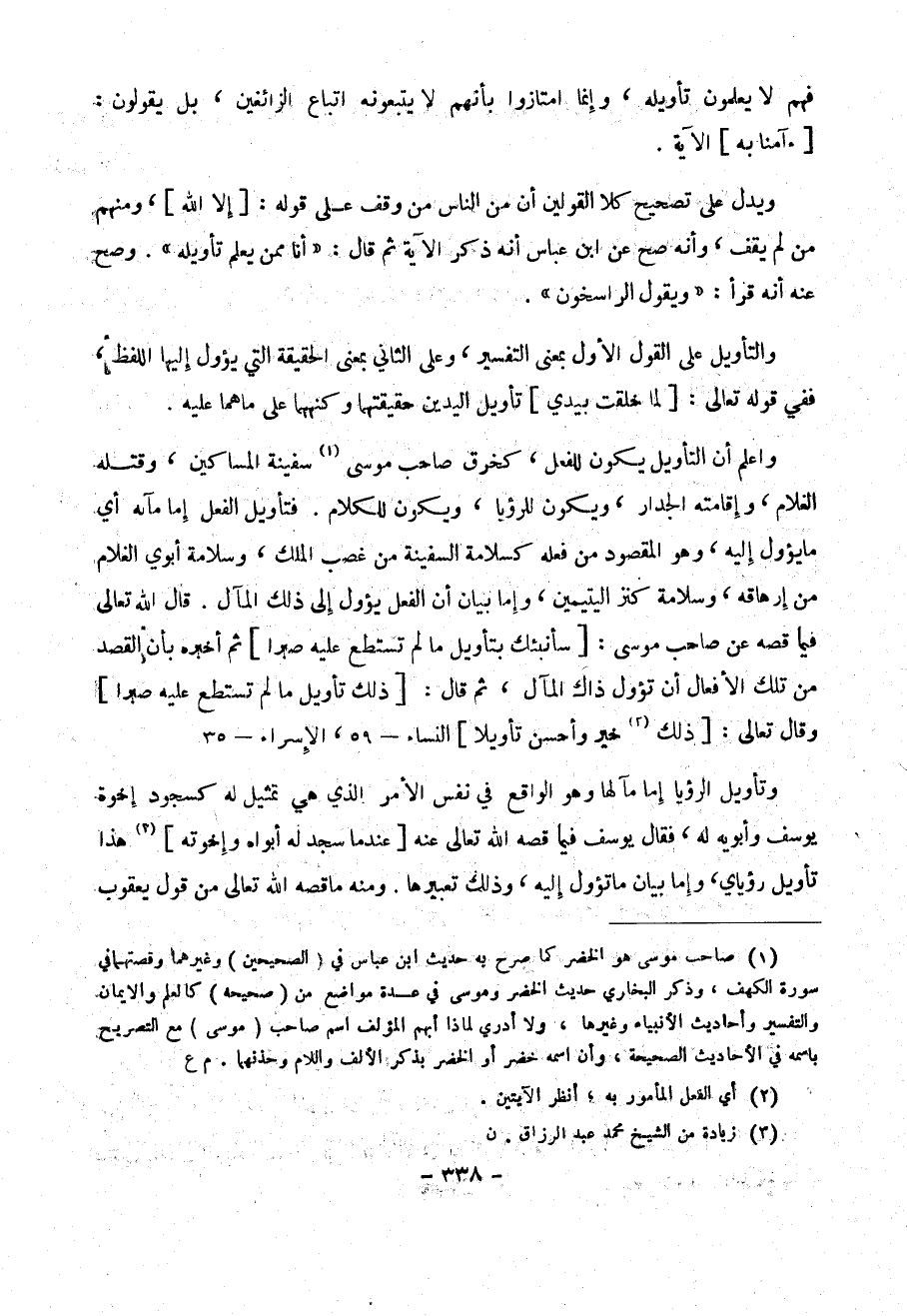 واعلم أن التأويل يكون للفعل ، كخرق صاحب موسى (1) سفينة المساكين ، وقتله الغلام وإقامته الجدار ، ويكون للرؤيا ، ويكون للكلام . فتأويل الفعل إما مآله أي ما يؤول إليه ، وهو المقصود من فعله كسلامة السفينة من غضب الملك ، وسلامة أبوي الغلام من إرهاقه ، وسلامة كنز اليتيمين ، وإما بيان أن الفعل يؤول إلى المآل . قال الله تعالى فيما قصة عن صاحب موسى : [ سَأُنَبِّئُكَ بِتَأْوِيلِ مَا لَمْ تَسْتَطِعْ عَلَيْهِ صَبْراً ] ثم أخبره بأن القصد من تلك الأفعال أن تؤول ذاك المآل ، ثم قال : [ ذَلِكَ تَأْوِيلُ مَا لَمْ تَسْطِعْ عَلَيْهِ صَبْراً ] وقال تعالى : [ ذَلِكَ (2) خَيْرٌ وَأَحْسَنُ تَأْوِيلاً ] النساء - 59 ، الإسراء- 35 .