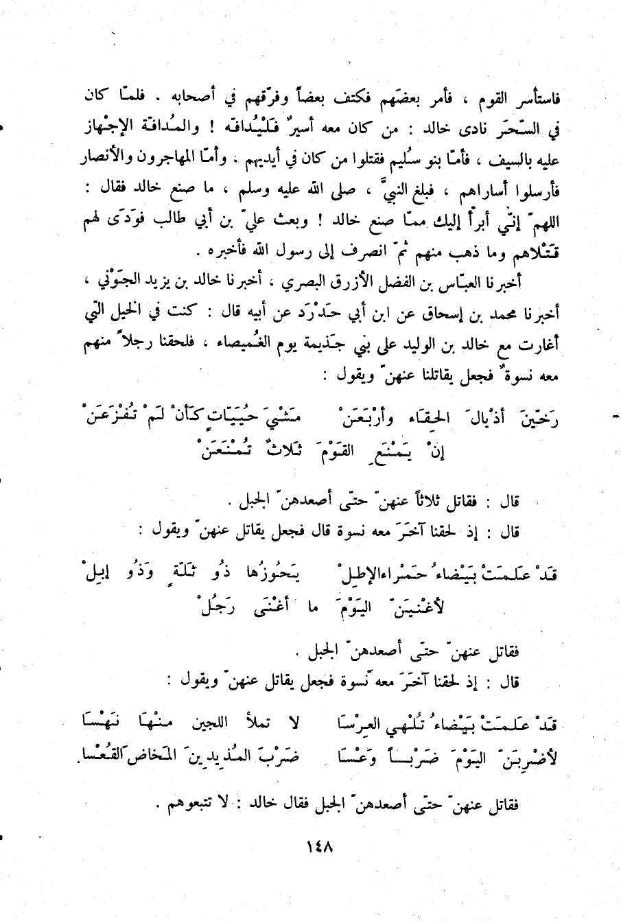 فَقَاتَلَ عَنْهُنَّ حَتَّى أَصْعَدَهُنَّ الْجَبَلَ فَقَالَ خَالِدٌ: لَا تَتَّبِعُوهُمْ "