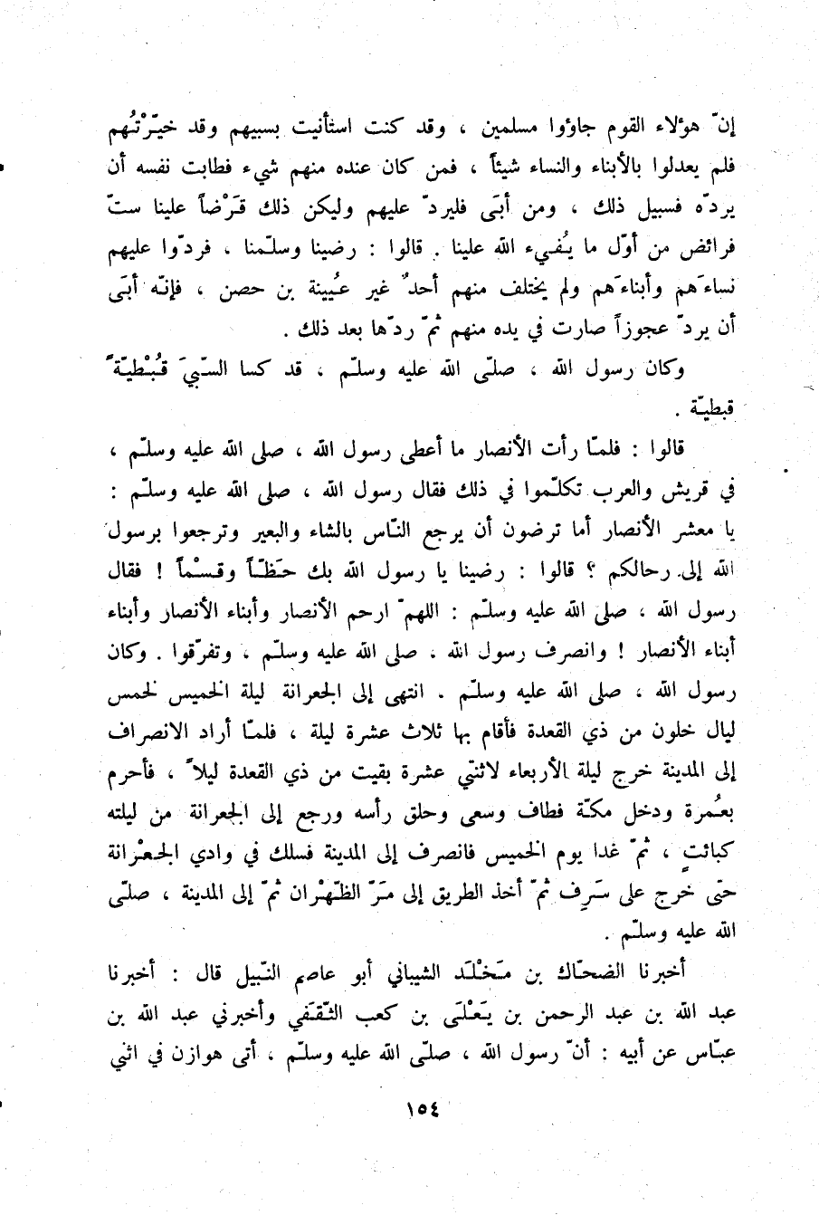 : «إِنَّ هَؤُلَاءِ الْقَوْمِ جَاءُوا مُسْلِمَيْنِ , وَقَدْ كُنْتُ اسْتَأْنَيْتُ بِسَبْيِهِمْ وَقَدْ خَيَّرْتُهُمْ فَلَمْ يَعْدِلُوا بِالْأَبْنَاءِ وَالنِّسَاءِ شَيْئًا فَمَنْ كَانَ عِنْدَهُ مِنْهُمْ شَيْءٌ فَطَابَتْ نَفْسُهُ أَنْ يَرُدَّهُ فَسَبِيلُ ذَلِكَ , وَمَنْ أَبَى فَلْيَرُدَّ عَلَيْهِمْ وَلْيَكُنْ ذَلِكَ قَرْضًا عَلَيْنَا سِتَّ فَرَائِضَ مِنْ أَوَّلِ مَا يُفِيءُ اللَّهُ عَلَيْنَا» ، قَالُوا: رَضِينَا وَسَلَّمْنَا فَرَدُّوا عَلَيْهِمْ نِسَاءَهُمْ وَأَبْنَاءَهُمْ وَلَمْ يَخْتَلِفْ مِنْهُمْ أَحَدٌ غَيْرُ عُيَيْنَةَ بْنُ حِصْنٍ فَإِنَّهُ أَبَى أَنْ يَرُدَّ عَجُوزًا صَارَتْ فِي يَدِهِ مِنْهُمْ ثُمَّ رَدَّهَا بَعْدَ ذَلِكَ، وَكَانَ رَسُولُ اللَّهِ صلّى الله عليه وسلم قَدْ كَسَا السَّبْيَ قُبْطِيَّةً قُبْطِيَّةً، قَالُوا: فَلَمَّا رَأَتِ الْأَنْصَارُ مَا أَعْطَى رَسُولُ اللَّهِ صلّى الله عليه وسلم فِي قُرَيْشٍ وَالْعَرَبِ تَكَلَّمُوا فِي ذَلِكَ، فَقَالَ رَسُولُ اللَّهِ صلّى الله عليه وسلم: «يَا مَعْشَرَ الْأَنْصَارِ، أَمَا تَرْضَوْنَ أَنْ يَرْجِعَ النَّاسُ بِالشَّاءِ وَالْبَعِيرِ وَتَرْجِعُوا بِرَسُولِ اللَّهِ إِلَى رِحَالِكُمْ؟» قَالُوا: رَضِينَا يَا رَسُولَ اللَّهِ بِكَ حَظًّا وَقَسْمًا، فَقَالَ رَسُولُ اللَّهِ صلّى الله عليه وسلم: «اللَّهُمَّ ارْحَمِ الْأَنْصَارَ، وَأَبْنَاءَ الْأَنْصَارِ، وَأَبْنَاءَ أَبْنَاءِ الْأَنْصَارِ» . وَانْصَرَفَ رَسُولُ اللَّهِ صلّى الله عليه وسلم وَتَفَرَّقُوا وَكَانَ رَسُولُ اللَّهِ صلّى الله عليه وسلم انْتَهَى إِلَى الْجِعْرَانَةِ لَيْلَةَ الْخَمِيسِ لِخَمْسِ لَيَالٍ خَلَوْنَ مِنْ ذِي الْقَعْدَةِ فَأَقَامَ بِهَا ثَلَاثَ عَشْرَةَ لَيْلَةً فَلَمَّا أَرَادَ الِانْصِرَافَ إِلَى الْمَدِينَةِ خَرَجَ لَيْلَةَ الْأَرْبِعَاءِ لِاثْنَتَيْ عَشْرَةَ بَقِيَتْ مِنْ ذِي الْقَعْدَةِ لَيْلًا , فَأَحْرَمَ بِعُمْرَةٍ وَدَخَلَ مَكَّةَ فَطَافَ وَسَعَى وَحَلَقَ رَأْسَهُ وَرَجَعَ إِلَى الْجِعْرَانَةِ مِنْ لَيْلَتِهِ كَبَائِتٍ ثُمَّ غَدَا يَوْمَ الْخَمِيسِ فَانْصَرَفَ إِلَى الْمَدِينَةِ فَسَلَكَ فِي وَادِي الْجِعْرَانَةِ حَتَّى خَرَجَ عَلَى سَرِفَ ثُمَّ أَخَذَ الطَّرِيقَ إِلَى مَرِّ الظَّهْرَانِ ثُمَّ إِلَى الْمَدِينَةِ , صلّى الله عليه وسلم