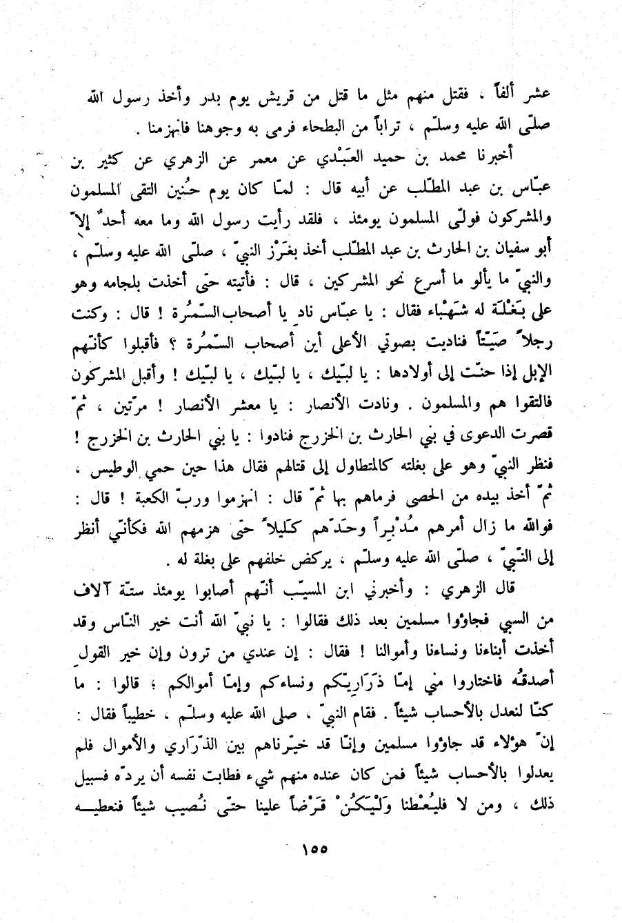 أَخْبَرَنَا مُحَمَّدُ بْنُ حُمَيْدٍ الْعَبْدِيُّ، عَنْ مَعْمَرٍ، عَنِ الزُّهْرِيِّ، عَنْ كَثِيرِ بْنِ عَبَّاسِ بْنِ عَبْدِ الْمُطَّلِبِ، عَنْ أَبِيهِ، قَالَ: " لَمَّا كَانَ يَوْمُ حُنَيْنٍ الْتَقَى الْمُسْلِمُونَ وَالْمُشْرِكُونَ فَوَلَّى الْمُسْلِمُونَ يَوْمَئِذٍ , فَلَقَدْ رَأَيْتُ رَسُولَ اللَّهِ وَمَا مَعَهُ أَحَدٌ إِلَّا أَبُو سُفْيَانَ بْنُ الْحَارِثِ بْنِ عَبْدِ الْمُطَّلِبِ أَخَذَ بِغَرْزِ النَّبِيِّ صلّى الله عليه وسلم، وَالنَّبِيُّ مَا يَأْلُو مَا أَسْرَعَ نَحْوَ الْمُشْرِكِينَ , قَالَ: فَأَتَيْتُهُ حَتَّى أَخَذْتُ بِلِجَامِهِ وَهُوَ عَلَى بَغْلَةٍ لَهُ شَهْبَاءَ، فَقَالَ: «يَا عَبَّاسُ، §نَادِ يَا أَصْحَابَ السَّمُرَةِ» ، قَالَ: وَكُنْتُ رَجُلًا صَيِّتًا، فَنَادَيْتُ بِصَوْتِيَ الْأَعْلَى: أَيْنَ أَصْحَابُ السَّمُرَةَ؟ فَأَقْبَلُوا كَأَنَّهُمُ الْإِبِلُ إِذَا حَنَّتْ إِلَى أَوْلَادِهَا: يَا لَبَّيْكَ، يَا لَبَّيْكَ، يَا لَبَّيْكَ , وَأَقْبَلَ الْمُشْرِكُونَ فَالْتَقَوْا هُمْ وَالْمُسْلِمُونَ، وَنَادَتِ الْأَنْصَارُ: يَا مَعْشَرَ الْأَنْصَارِ مَرَّتَيْنِ، ثُمَّ قُصِرَتِ الدَّعْوَى فِي بَنِي الْحَارِثِ بْنِ الْخَزْرَجِ فَنَادَوْا: يَا بَنِي الْحَارِثِ بْنَ الْخَزْرَجِ، فَنَظَرَ النَّبِيُّ وَهُوَ عَلَى بَغْلَتِهِ كَالْمُتَطَاوِلِ إِلَى قِتَالِهِمْ، فَقَالَ: «هَذَا حِينَ حَمِيَ الْوَطِيسُ» ثُمَّ أَخَذَ بِيَدِهِ مِنَ الْحَصَى فَرَمَاهُمْ بِهَا ثُمَّ قَالَ: «انْهَزَمُوا وَرَبِّ الْكَعْبَةِ» قَالَ: فَوَاللَّهِ مَا زَالَ أَمَرُهُمْ مُدْبِرًا وَحَدُّهُمْ كَلِيلًا حَتَّى هَزَمَهُمُ اللَّهُ، فَكَأَنِّي أَنْظُرُ إِلَى النَّبِيِّ صلّى الله عليه وسلم يَرْكُضُ خَلْفَهُمْ عَلَى بَغْلَةٍ لَهُ "