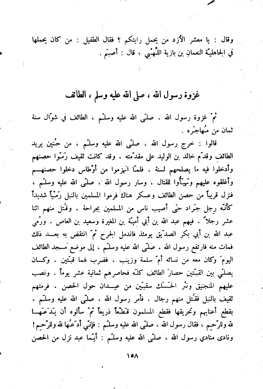 §غَزْوَةُ رَسُولِ اللَّهِ صلّى الله عليه وسلم الطَّائِفَ ثُمَّ غَزْوَةُ رَسُولِ اللَّهِ صلّى الله عليه وسلم الطَّائِفَ فِي شَوَّالٍ سَنَةَ ثَمَانٍ مِنْ مُهَاجَرِهِ. قَالُوا: خَرَجَ رَسُولُ اللَّهِ صلّى الله عليه وسلم مِنْ حُنَيْنٍ يُرِيدُ الطَّائِفَ، وَقَدَّمَ خَالِدَ بْنَ الْوَلِيدِ عَلَى مُقَدِّمَتِهِ، وَقَدْ كَانَتْ ثَقِيفٌ رَمَّوْا حِصْنَهُمْ وَأَدْخَلُوا فِيهِ مَا يُصْلِحُهُمْ لِسَنَةٍ، فَلَمَّا انْهَزَمُوا مِنْ أَوْطَاسٍ دَخَلُوا حِصْنَهُمْ وَأَغْلَقُوهُ عَلَيْهِمْ وَتَهَيَّأُوا لِلْقِتَالِ , وَسَارَ رَسُولُ اللَّهِ صلّى الله عليه وسلم فَنَزَلَ قَرِيبًا مِنْ حِصْنِ الطَّائِفِ وَعَسْكَرَ هُنَاكَ , فَرَمَوُا الْمُسْلِمِينَ بِالنَّبْلِ رَمْيًا شَدِيدًا كَأَنَّهُ رِجْلُ جَرَادٍ، حَتَّى أُصِيبَ نَاسٌ مِنَ الْمُسْلِمِينَ بِجِرَاحَةٍ , وَقُتِلَ مِنْهُمُ اثْنَا عَشَرَ رَجُلًا فِيهِمْ عَبْدُ اللَّهِ بْنُ أَبِي أُمَيَّةَ بْنِ الْمُغِيرَةِ وَسَعِيدُ بْنُ الْعَاصِ , وَرُمِيَ عَبْدُ اللَّهِ بْنُ أَبِي بَكْرٍ الصِّدِّيقِ يَوْمَئِذٍ فَانْدَمَلَ الْجُرْحُ ثُمَّ انْتَفَضَ بِهِ بَعْدَ ذَلِكَ فَمَاتَ مِنْهُ. فَارْتَفَعَ رَسُولُ اللَّهِ صلّى الله عليه وسلم إِلَى مَوْضِعِ مَسْجِدِ الطَّائِفِ الْيَوْمَ وَكَانَ مَعَهُ مِنْ نِسَائِهِ أُمُّ سَلَمَةَ وَزَيْنَبُ فَضَرَبَ لَهُمَا قُبَّتَيْنِ , وَكَانَ يُصَلِّي بَيْنَ الْقُبَّتَيْنِ حِصَارَ الطَّائِفِ كُلَّهُ فَحَاصَرَهُمْ ثَمَانِيَةَ عَشَرَ يَوْمًا وَنَصَبَ عَلَيْهِمُ الْمَنْجَنِيقَ وَنَثَرَ الْحَسَكَ سُقْبَيْنِ مِنْ عِيدَانٍ حَوْلَ الْحِصْنِ فَرَمَتْهُمْ ثَقِيفٌ بِالنَّبْلِ فَقُتِلَ مِنْهُمْ رِجَالٌ فَأَمَرَ رَسُولُ اللَّهِ صلّى الله عليه وسلم بِقَطْعِ أَعْنَابِهِمْ وَتَحْرِيقِهَا فَقَطَعَ الْمُسْلِمُونَ قَطْعًا ذَرِيعًا ثُمَّ سَأَلُوهُ أَنْ يَدَعَهَا لِلَّهِ وَلِلرَّحِمِ فَقَالَ رَسُولُ اللَّهِ صلّى الله عليه وسلم: «فَإِنِّي أَدَعُهَا لِلَّهِ وَلِلرَّحِمِ» وَنَادَى مُنَادِيَ رَسُولِ اللَّهِ صلّى الله عليه وسلم: «إِيُّمَا عَبْدٍ نَزَلَ مِنَ الْحِصْنِ