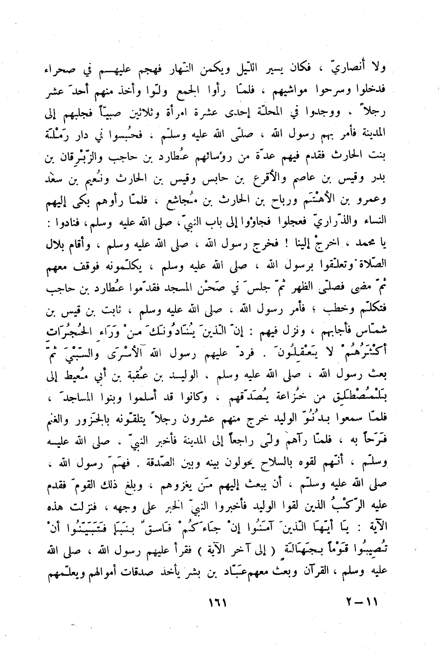 وَلَا أَنْصَارِيٌّ فَكَانَ يَسِيرُ اللَّيْلَ وَيَكْمُنُ النَّهَارَ فَهَجَمَ عَلَيْهِمْ فِي صَحْرَاءَ فَدَخَلُوا وَسَرَّحُوا مَوَاشِيَهُمْ فَلَمَّا رَأَوُا الْجَمْعَ وَلَّوْا وَأَخَذَ مِنْهُمْ أَحَدَ عَشَرَ رَجُلًا وَوَجَدُوا فِي الْمَحِلَّةِ إِحْدَى عَشْرَةَ امْرَأَةً وَثَلَاثِينَ صَبِيًّا فَجَلَبَهُمْ إِلَى الْمَدِينَةِ فَأَمَرَ بِهِمْ رَسُولُ اللَّهِ صلّى الله عليه وسلم فَحُبِسُوا فِي دَارِ رَمْلَةَ بِنْتِ الْحَارِثِ فَقَدِمَ فِيهِمْ عِدَّةٌ مِنْ رُؤَسَائِهِمْ: عُطَارِدُ بْنُ حَاجِبٍ وَالزِّبْرِقَانُ بْنُ بَدْرٍ وَقَيْسُ بْنُ عَاصِمٍ وَالْأَقْرَعُ بْنُ حَابِسٍ وَقَيْسُ بْنُ الْحَارِثِ وَنُعَيْمُ بْنُ سَعْدٍ وَعَمْرُو بْنُ الْأَهْتَمِ وَرَبَاحُ بْنُ الْحَارِثِ بْنُ مُجَاشِعٍ فَلَمَّا رَأَوْهُمْ بَكَى إِلَيْهِمُ النِّسَاءُ وَالذَّرَارِيُّ فَعَجِلُوا فَجَاءُوا إِلَى بَابِ النَّبِيِّ صلّى الله عليه وسلم فَنَادَوْا: يَا مُحَمَّدُ اخْرُجْ إِلَيْنَا فَخَرَجَ رَسُولُ اللَّهِ صلّى الله عليه وسلم , وَأَقَامَ بِلَالٌ الصَّلَاةَ وَتَعَلَّقُوا بِرَسُولِ اللَّهِ صلّى الله عليه وسلم يُكَلِّمُونَهُ فَوَقَفَ مَعَهُمْ ثُمَّ مَضَى فَصَلَّى الظُّهْرَ ثُمَّ جَلَسَ فِي صَحْنِ الْمَسْجِدِ , فَقَدَّمُوا عُطَارِدَ بْنَ حَاجِبٍ فَتَكَلَّمَ وَخَطَبَ فَأَمَرَ رَسُولُ اللَّهِ صلّى الله عليه وسلم ثَابِتَ بْنَ قَيْسِ بْنَ شَمَّاسٍ فَأَجَابَهُمْ وَنَزَلَ فِيهِمْ {إِنَّ الَّذِينَ يُنَادُونَكَ مِنْ وَرَاءِ الْحُجُرَاتِ أَكْثَرَهُمْ لَا يَعْقِلُونَ} [الحجرات: 4] ، فَرَدَّ عَلَيْهِمْ رَسُولُ اللَّهِ الْأَسْرَى وَالسَّبْيَ ثُمَّ بَعَثَ رَسُولُ اللَّهِ صلّى الله عليه وسلم الْوَلِيدَ بْنَ عُقْبَةَ بْنَ أَبِي مُعَيْطٍ إِلَى بَلْمُصْطَلِقِ مِنْ خُزَاعَةَ يُصَدِّقْهُمْ وَكَانُوا قَدْ أَسْلَمُوا وَبَنَوُا الْمَسَاجِدَ فَلَمَّا سَمِعُوا بِدُنُوِّ الْوَلِيدِ خَرَجَ مِنْهُمْ عِشْرُونَ رَجُلًا يَتَلَقَّوْنَهُ بِالْجَزُورِ وَالْغَنَمِ فَرَحًا , بِهِ فَلَمَّا رَآهُمْ وَلَّى رَاجِعًا إِلَى الْمَدِينَةِ فَأُخْبِرَ النَّبِيَّ صلّى الله عليه وسلم , أَنَّهُمْ لَقُوهُ بِالسِّلَاحِ يَحُولُونَ بَيْنَهُ وَبَيْنَ الصَّدَقَةِ. فَهَمَّ رَسُولُ اللَّهِ صلّى الله عليه وسلم أَنْ يَبْعَثَ إِلَيْهِمْ مَنْ يَغْزُوهُمْ وَبَلَغَ ذَلِكَ الْقَوْمَ فَقَدِمَ عَلَيْهِ الرُّكَبُ الَّذِينَ لَقُوا الْوَلِيدَ فَأَخْبَرُوا النَّبِيَّ الْخَبَرَ عَلَى وَجْهِهِ فَنَزَلَتْ هَذِهِ الْآيَةُ {يَا أَيُّهَا الَّذِينَ آمَنُوا إِنْ جَاءَكُمْ فَاسِقٌ بِنَبَإٍ فَتَبَيَّنُوا أَنْ تُصِيبُوا قَوْمًا بِجَهَالَةٍ} إِلَى آخِرِ الْآيَةِ، فَقَرَأَ عَلَيْهِمْ رَسُولُ اللَّهِ صلّى الله عليه وسلم الْقُرْآنَ وَبَعَثَ مَعَهُمْ عَبَّادَ بْنَ بِشْرٍ يَأْخُذُ صَدَقَاتِ أَمْوَالِهِمْ وَيُعَلِّمُهُمْ