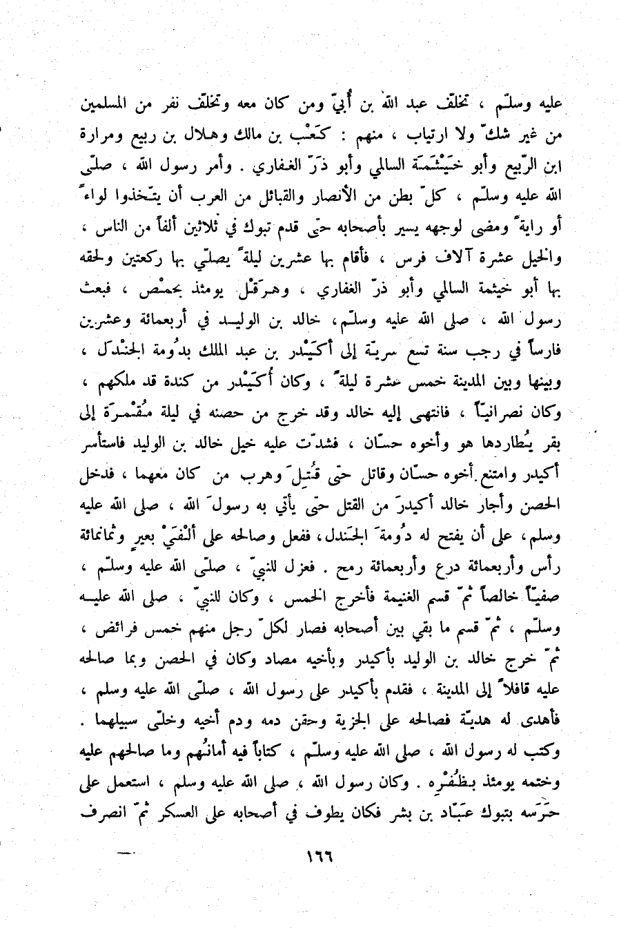 عليه وسلم تَخَلَّفَ عَبْدُ اللَّهِ بْنُ أُبَيٍّ وَمَنْ كَانَ مَعَهُ وَتَخَلَّفَ نَفَرٌ مِنَ الْمُسْلِمِينَ مِنْ غَيْرِ شَكٍّ وَلَا ارْتِيَابٍ مِنْهُمْ: كَعْبُ بْنُ مَالِكٍ وَهِلَالُ بْنُ رَبِيعٍ وَمُرَارَةُ بْنُ الرَّبِيعِ وَأَبُو خَيْثَمَةَ السَّالِمِيِّ , وَأَبُو ذَرٍّ الْغِفَارِيُّ وَأَمَرَ رَسُولُ اللَّهِ صلّى الله عليه وسلم كُلَّ بَطْنٍ مِنَ الْأَنْصَارِ وَالْقَبَائِلِ مِنَ الْعَرَبِ أَنْ يَتَّخِذُوا لِوَاءً أَوْ رَايَةً وَمَضَى لِوَجْهِهِ يَسِيرُ بِأَصْحَابِهِ حَتَّى قَدِمَ تَبُوكَ فِي ثَلَاثِينَ أَلْفًا مِنَ النَّاسِ , وَالْخَيْلُ عَشَرَةُ آلَافِ فَرَسٍ فَأَقَامَ بِهَا عِشْرِينَ لَيْلَةً يُصَلِّي بِهَا رَكْعَتَيْنِ وَلَحِقَهُ بِهَا أَبُو خَيْثَمَةَ السَّالِمِيُّ وَأَبُو ذَرٍّ الْغِفَارِيُّ وَهِرَقْلُ يَوْمَئِذٍ بِحِمْصَ فَبَعَثَ رَسُولُ اللَّهِ صلّى الله عليه وسلم خَالِدَ بْنَ الْوَلِيدِ فِي أَرْبَعِمِائَةٍ وَعِشْرِينَ فَارِسًا فِي رَجَبٍ سَنَةَ تِسْعٍ , سَرِيَّةً إِلَى أُكَيْدِرِ بْنِ عَبْدِ الْمَلِكِ بِدُومَةِ الْجَنْدَلِ وَبَيْنَهَا وَبَيْنَ الْمَدِينَةِ خَمْسَ عَشْرَةَ لَيْلَةً وَكَانَ أُكَيْدِرُ مِنْ كِنْدَةَ قَدْ مَلَكَهُمْ وَكَانَ نَصْرَانِيًّا فَانْتَهَى إِلَيْهِ خَالِدٌ وَقَدْ خَرَجَ مِنْ حِصْنِهِ فِي لَيْلَةٍ مُقْمِرَةٍ إِلَى بَقَرٍ يُطَارِدُهَا هُوَ وَأَخُوهُ حَسَّانُ فَشَدَّتْ عَلَيْهِ خَيْلُ خَالِدِ بْنِ الْوَلِيدِ فَاسْتَأْسَرَ أُكَيْدِرَ وَامْتَنَعَ أَخُوهُ حَسَّانُ وَقَاتَلَ حَتَّى قُتِلَ وَهَرَبَ مَنْ كَانَ مَعَهُمَا فَدَخَلَ الْحِصْنَ وَأَجَارَ خَالِدٌ أُكَيْدِرَ مِنَ الْقَتْلِ حَتَّى يَأْتِيَ بِهِ رَسُولَ اللَّهِ صلّى الله عليه وسلم عَلَى أَنْ يَفْتَحَ لَهُ دُومَةَ الْجَنْدَلِ فَفَعَلَ وَصَالَحَهُ عَلَى أَلْفَيْ بَعِيرٍ وَثَمَانِمِائَةِ رَأْسٍ وَأَرْبَعِمِائَةِ دِرْعٍ وَأَرْبَعِمِائَةِ رُمْحٍ فَعَزَلَ لِلنَّبِيِّ صلّى الله عليه وسلم صَفِيًّا خَالِصًا ثُمَّ قَسَمَ الْغَنِيمَةَ فَأَخْرَجَ الْخُمُسَ , وَكَانَ لِلنَّبِيِّ صلّى الله عليه وسلم , ثُمَّ قَسَمَ مَا بَقِيَ بَيْنَ أَصْحَابِهِ فَصَارَ لِكُلِّ رَجُلٍ مِنْهُمْ خَمْسُ فَرَائِضَ ثُمَّ خَرَجَ خَالِدُ بْنُ الْوَلِيدِ بِأُكَيْدِرَ وَبِأَخِيهِ مَصَادٍ وَكَانَ فِي الْحِصْنِ وَبِمَا صَالَحَهُ عَلَيْهِ قَافِلًا إِلَى الْمَدِينَةِ فَقَدِمَ بِأُكَيْدِرَ عَلَى رَسُولِ اللَّهِ صلّى الله عليه وسلم فَأَهْدَى لَهُ هَدِيَّةً فَصَالَحَهُ عَلَى الْجِزْيَةِ وَحَقَنَ دَمَهُ وَدَمَ أَخِيهِ وَخَلَّى سَبِيلَهُمَا وَكَتَبَ لَهُ رَسُولُ اللَّهِ صَلَّى. اللَّهُ عَلَيْهِ وَسَلَّمَ كِتَابًا فِيهِ أَمَانُهُمْ وَمَا صَالَحَهُمْ عَلَيْهِ وَخَتَمَهُ يَوْمَئِذٍ بِظُفْرِهِ وَكَانَ رَسُولُ اللَّهِ صلّى الله عليه وسلم اسْتَعْمَلَ عَلَى حَرَسِهِ بِتَبُوكَ عَبَّادَ بْنَ بِشْرٍ فَكَانَ يَطُوفُ فِي أَصْحَابِهِ عَلَى الْعَسْكَرِ ثُمَّ انْصَرَفَ