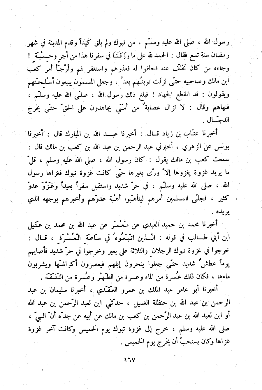 أَخْبَرَنَا مُحَمَّدُ بْنُ حُمَيْدٍ الْعَبْدِيُّ، عَنْ مَعْمَرٍ عَنْ عَبْدِ اللَّهِ بْنِ مُحَمَّدِ بْنِ عَقِيلِ بْنِ أَبِي طَالِبٍ، فِي قَوْلِهِ: {الَّذِينَ اتَّبَعُوهُ فِي سَاعَةِ الْعُسْرَةِ} [التوبة: 117] قَالَ: «§خَرَجُوا فِي غَزْوَةِ تَبُوكَ الرَّجُلَانِ وَالثَّلَاثَةُ عَلَى بَعِيرٍ، وَخَرَجُوا فِي حَرٍّ شَدِيدٍ، فَأَصَابَهُمْ يَوْمًا عَطَشٌ شَدِيدٌ حَتَّى جَعَلُوا يَنْحَرُونَ إِبِلَهُمْ فَيَعْصِرُونَ أَكْرَاشَهَا وَيَشْرَبُونَ مَاءَهَا , فَكَانَ ذَلِكَ عُسْرَةً مِنَ الْمَاءِ، وَعُسْرَةً مِنَ الْظَّهْرِ، وَعُسْرَةً مِنَ النَّفَقَةِ»