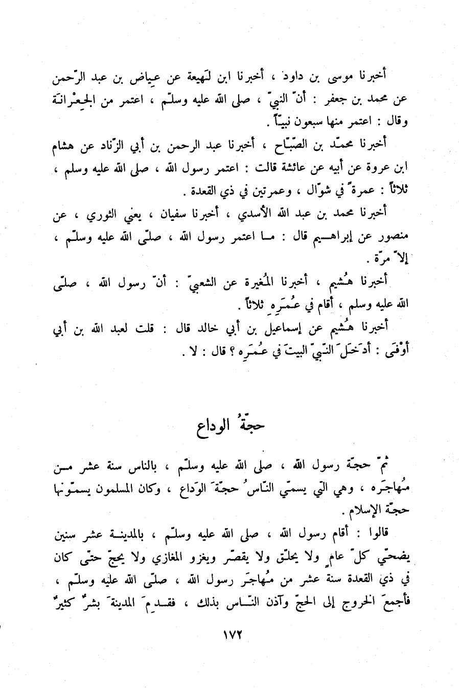 §حَجَّةُ الْوَدَاعِ ثُمَّ حَجَّةُ رَسُولِ اللَّهِ صلّى الله عليه وسلم بِالنَّاسِ سَنَةَ عَشْرٍ مِنْ مُهَاجَرِهِ وَهِيَ الَّتِي يُسَمِّي النَّاسُ حَجَّةَ الْوَدَاعِ , وَكَانَ الْمُسْلِمُونَ يُسَمُّونَهَا حَجَّةَ الْإِسْلَامِ، قَالُوا: أَقَامَ رَسُولُ اللَّهِ صلّى الله عليه وسلم بِالْمَدِينَةِ عَشْرَ سِنِينَ يُضَحِّي كُلَّ عَامٍ وَلَا يَحْلِقُ وَلَا يُقَصِّرُ وَيَغْزُو الْمَغَازِيَ وَلَا يَحُجُّ حَتَّى كَانَ فِي ذِي الْقَعْدَةِ سَنَةَ عَشْرٍ مِنْ مُهَاجَرِ رَسُولِ اللَّهِ صلّى الله عليه وسلم فَأَجْمَعَ الْخُرُوجَ إِلَى الْحَجِّ وَآذَنَ النَّاسَ بِذَلِكَ , فَقَدِمَ الْمَدِينَةَ بَشَرٌ كَثِيرٌ